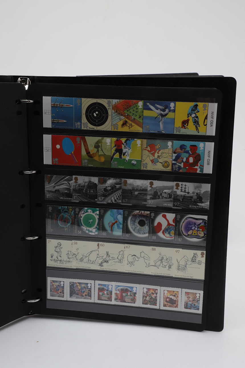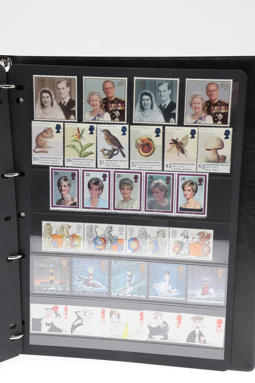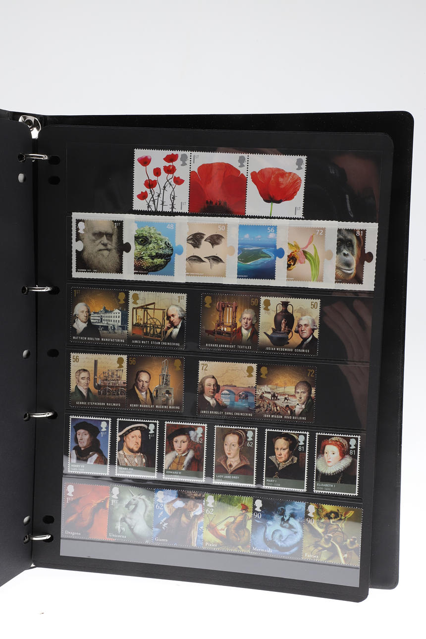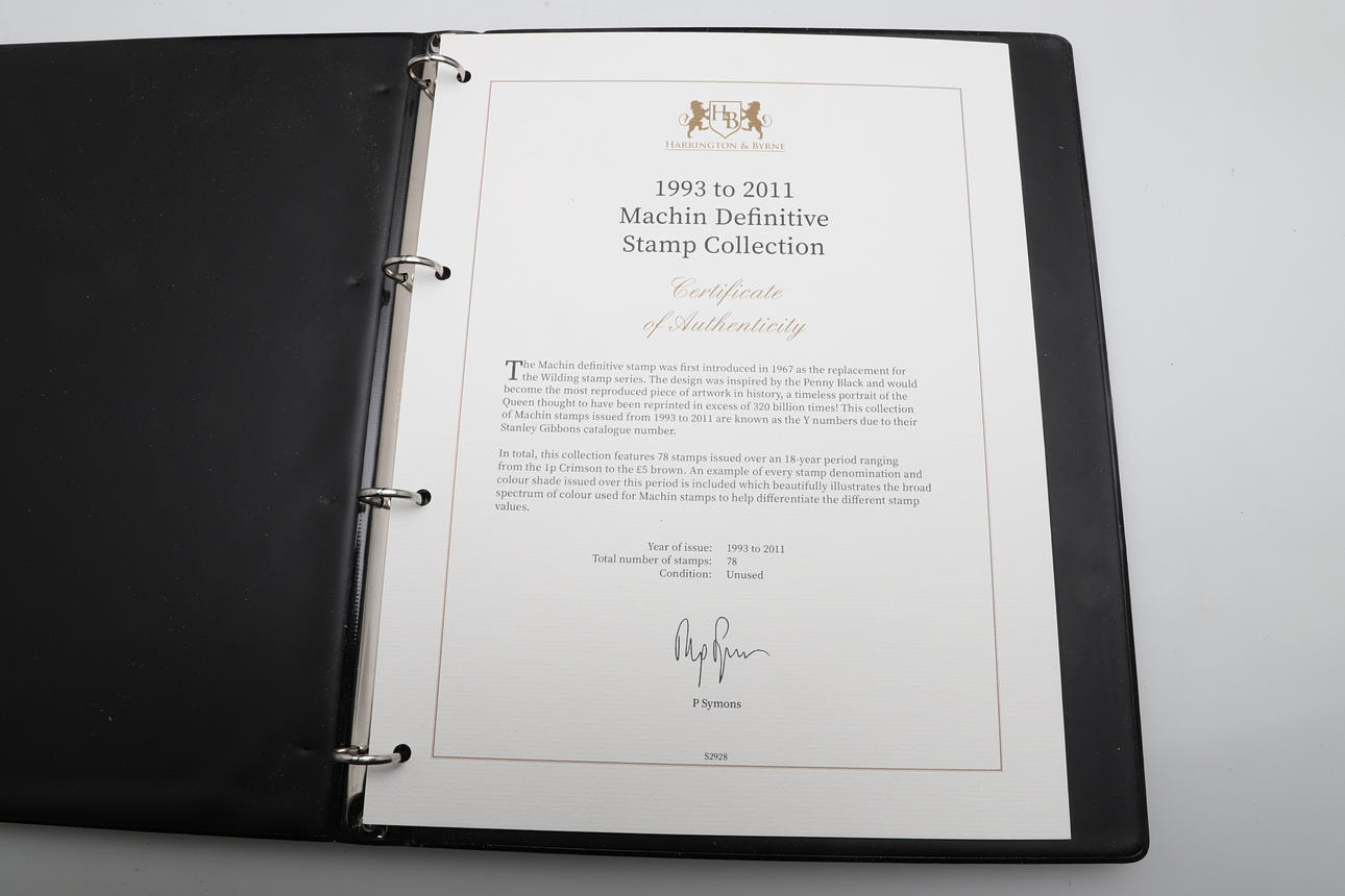 Four stamp booklets including 1996-1999 Complete GB Unused Commemorative Stamp Collection, 1992-1995 GB Unused Commemorative Collection, 1993-2011 Machin Definitive Stamp Collection, and 2008-2010 Complete GB Unused Stamp Collection. Booklets 29cms by 23cms.