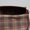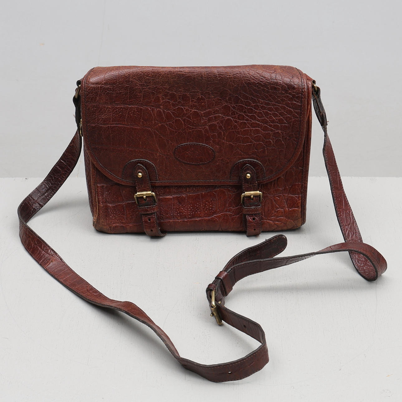 Leather shoulder bag with two buckles and an outer compartment at the front. Textile interior with an inner compartment. Marked 645047 on brass plaque. Dust bag included.