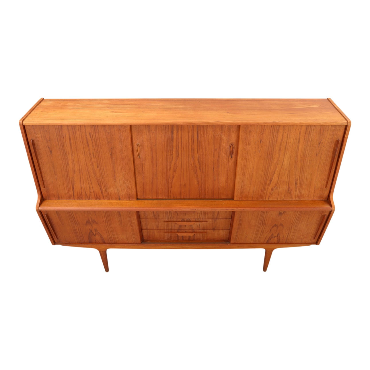 High sideboard made of veneer, oil-treated teak, front with sliding doors and drawers. Approx. 1960. H. 132, B. 194, D. 48 cm.