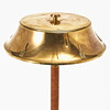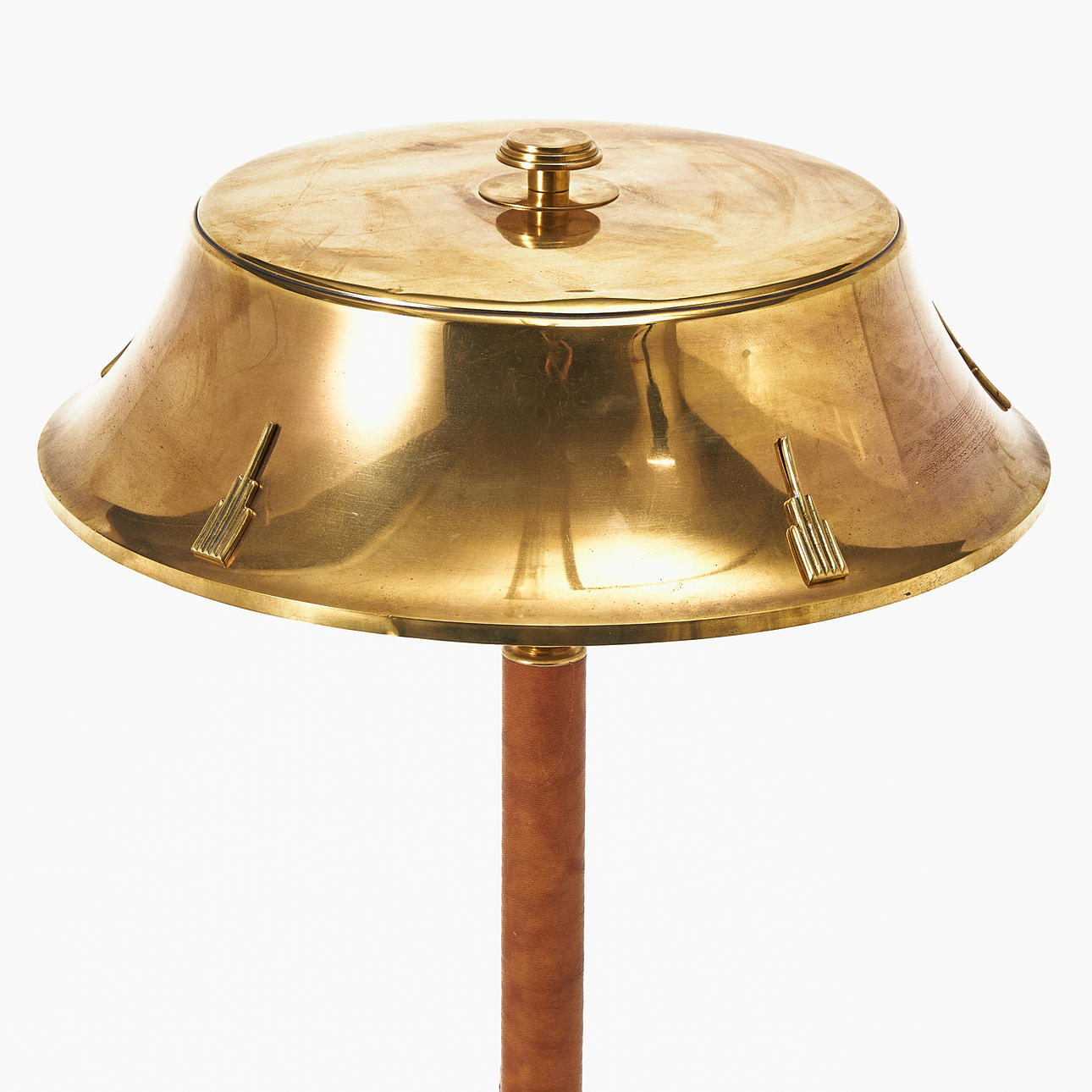 Circular profiled base on three low feet, the column covered in cognac-coloured leather, slightly flared shade in polished brass with cast decoration and terminal finial, marked with Boréns signature and model number 8411, height 49 cm, diameter 40 cm.