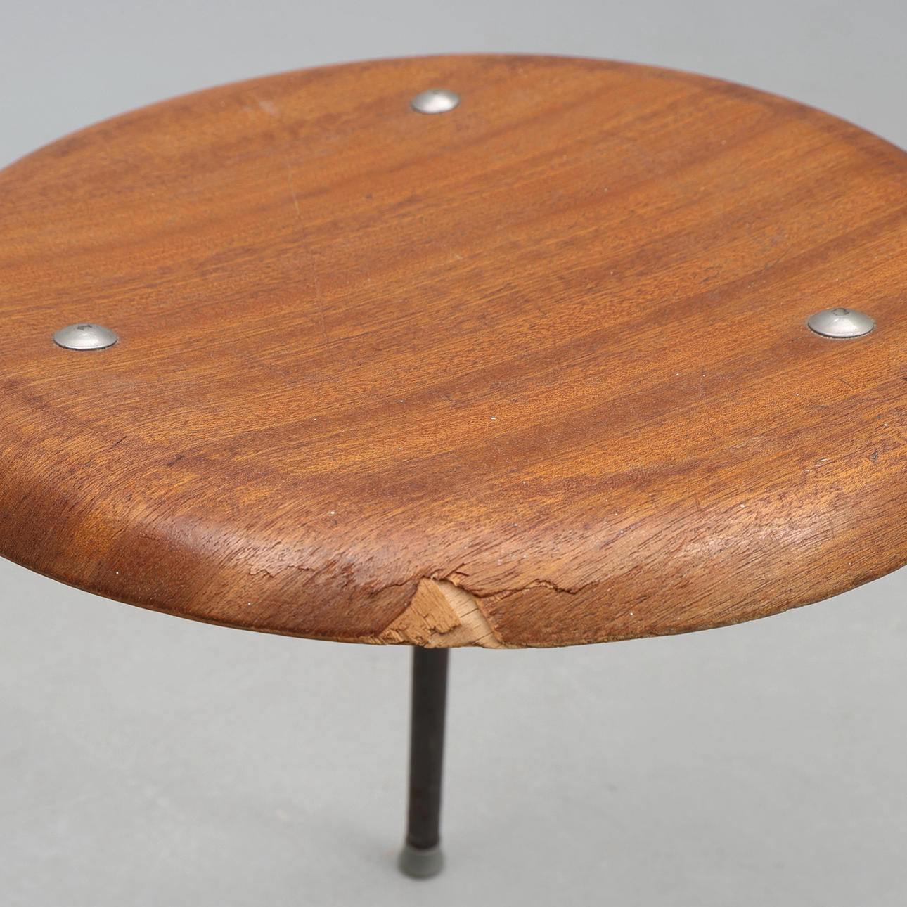 Normal wear and tear, missing screw head, visible scratches and chafing.