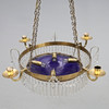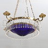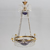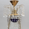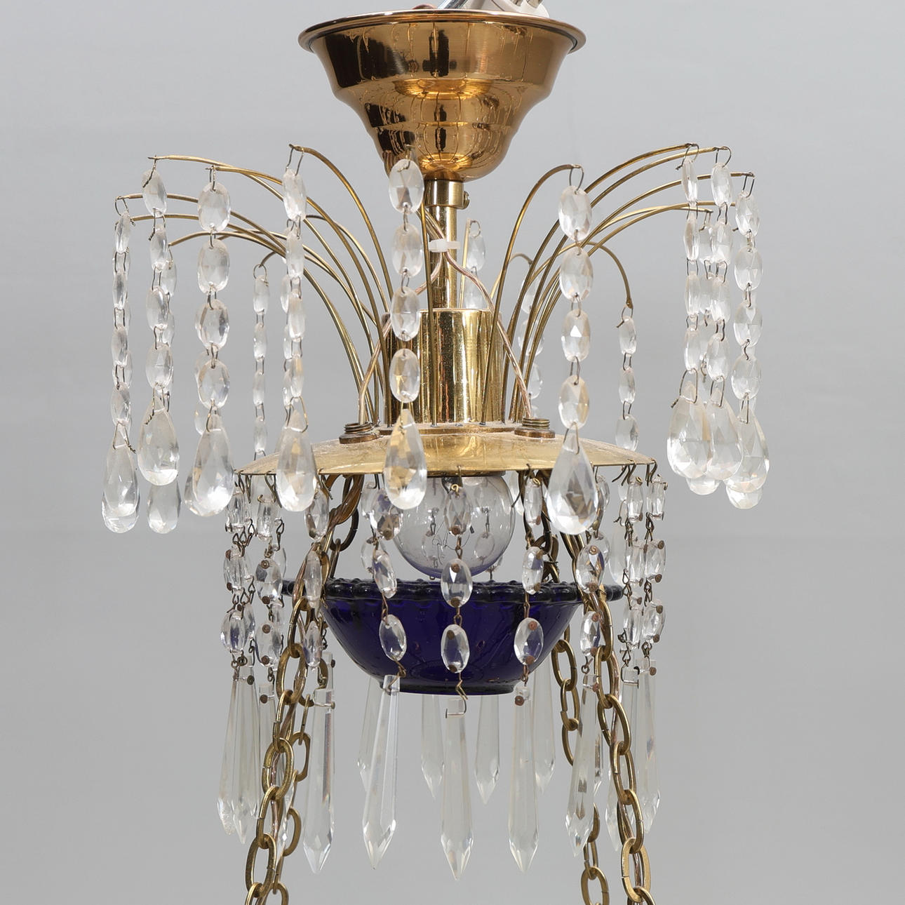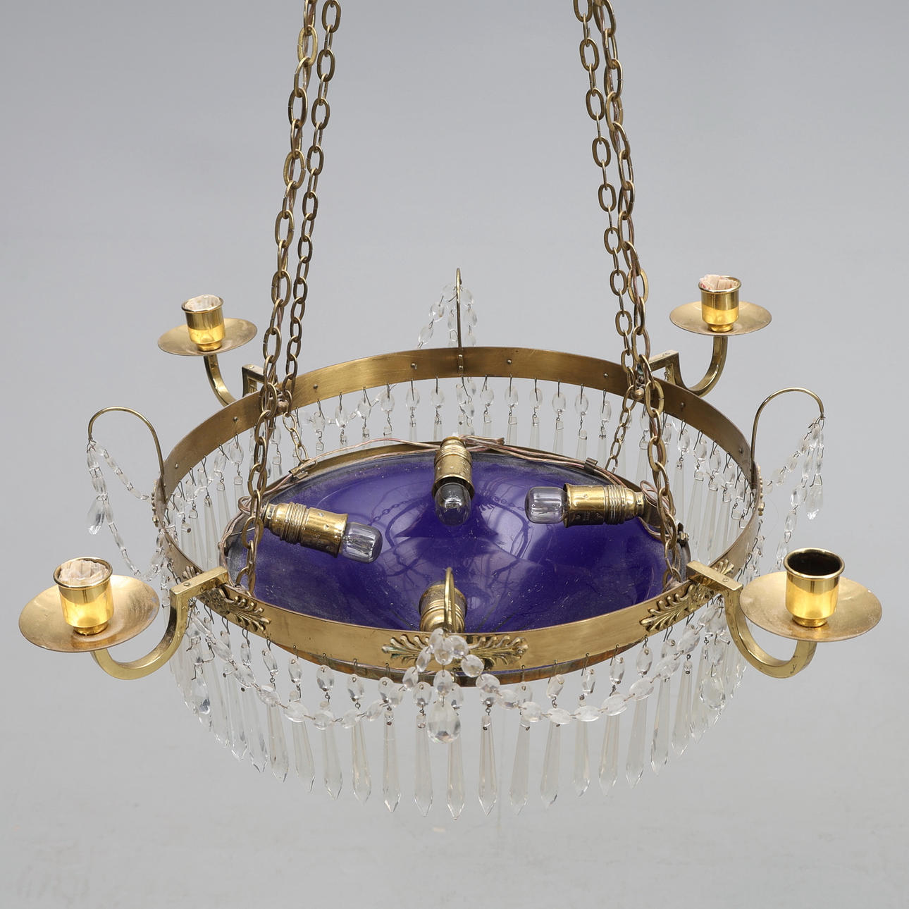 CHANDELIER for 4 candles and 4 bulbs, late Gustavian style with prisms, frame in brass, cup in blue glass, electrified.