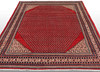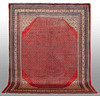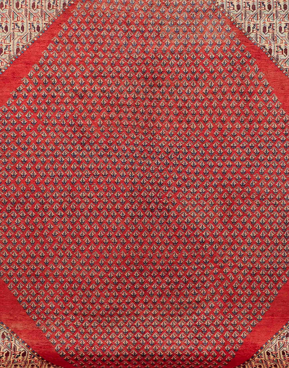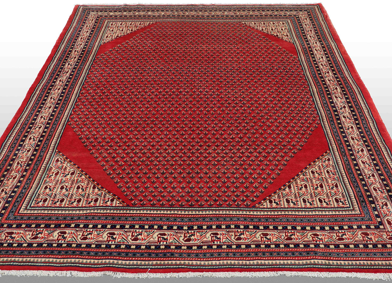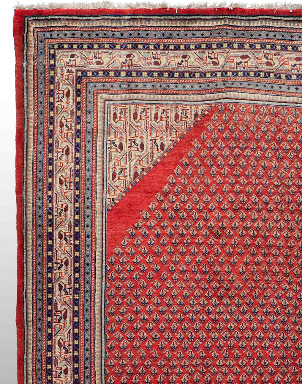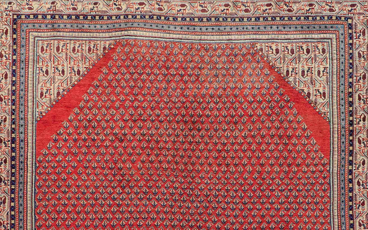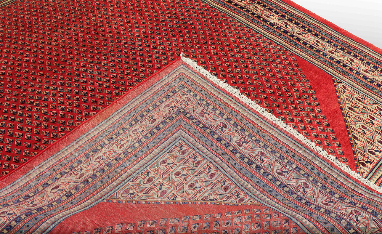 Saruk Mir rug with a red base and an over-patterned center field decorated with Boteh Mir motifs, in beige and dark accents. The border is made up of several narrow fields with stylized ornaments in harmonious colors. The forelock is made of wool and the warp is of cotton.