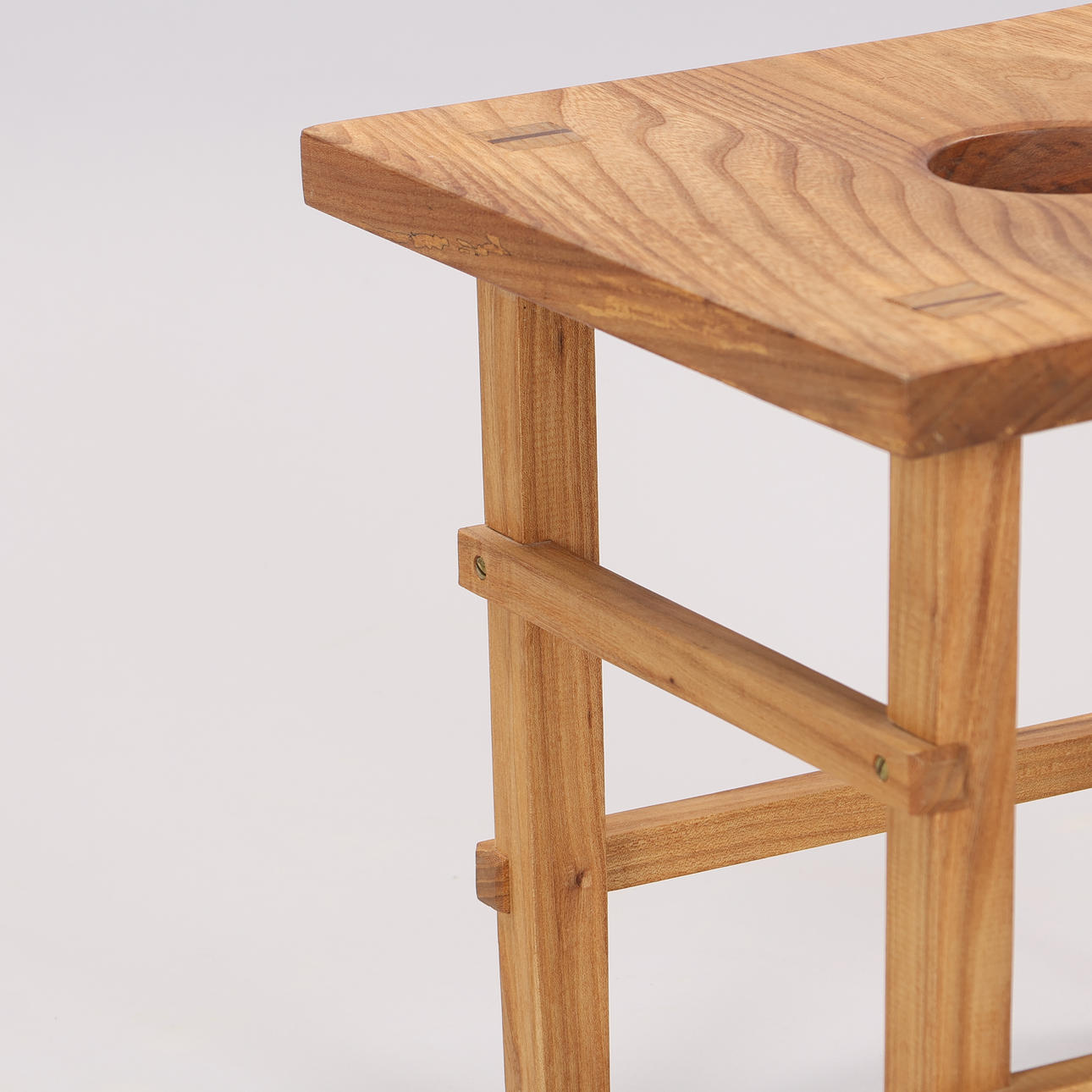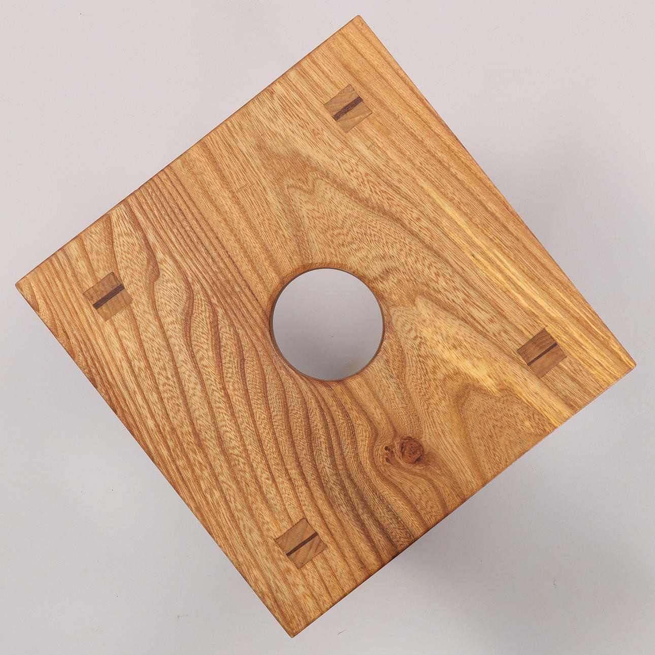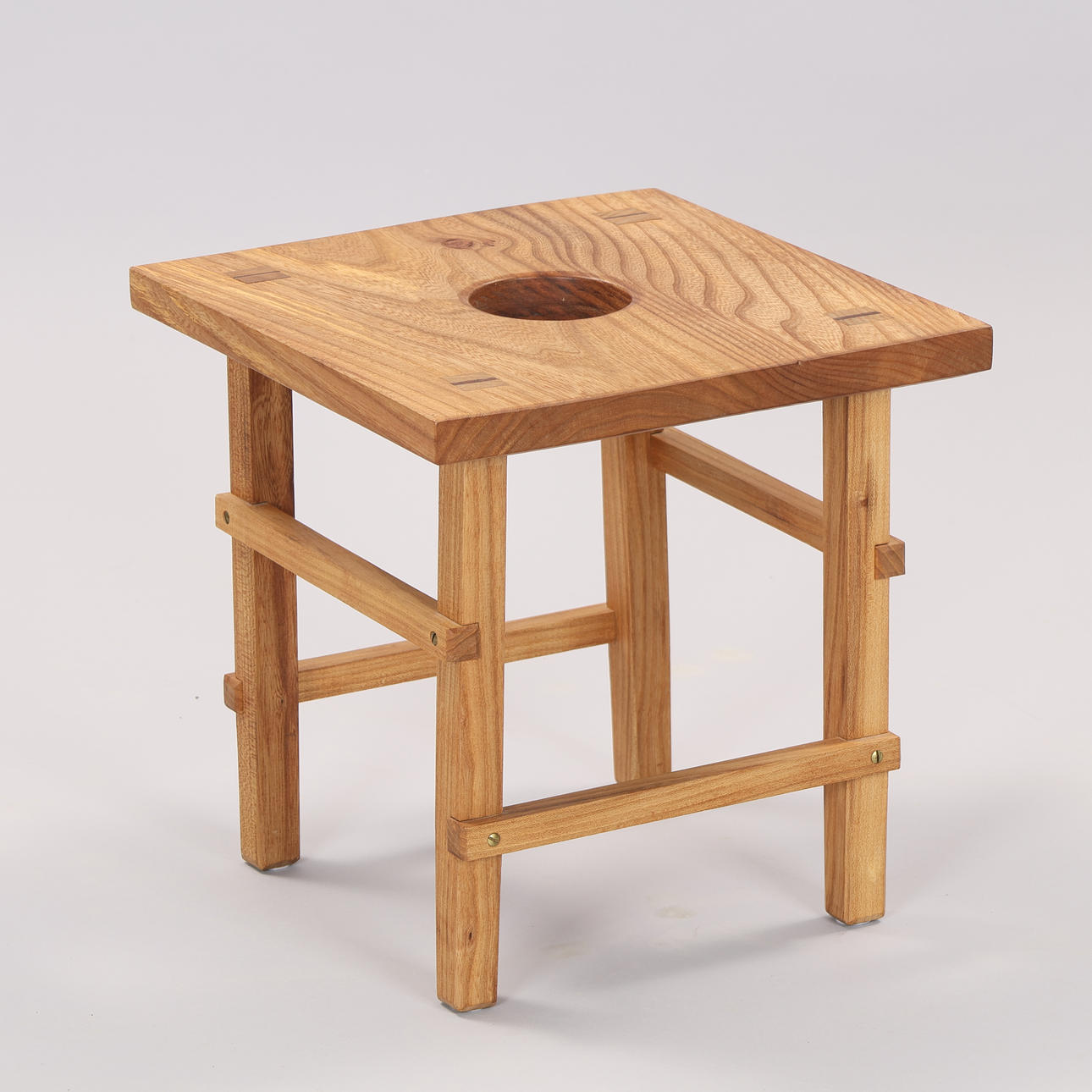 Stool in solid elm with visible mortise and tenon joints. Presumably crafted by a Scandinavian cabinetmaker.