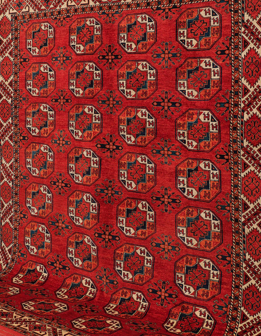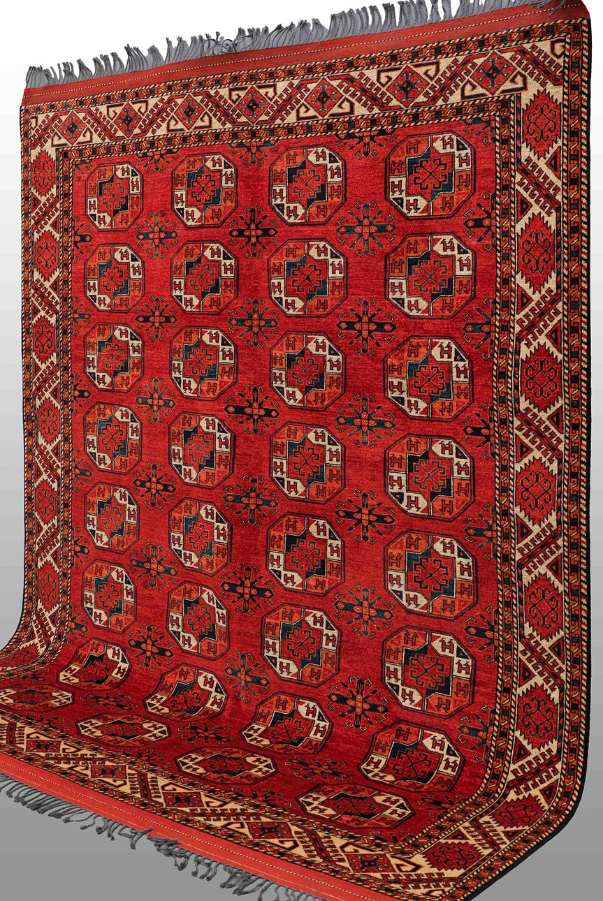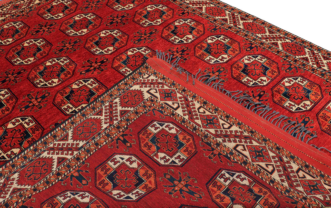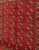 Turkeman with red background and repeated octogonal gull motifs in dark blue and beige. The border has a beige base color and geometric decor in red and dark blue. The bangs are made of wool and the warp is of wool.