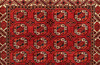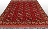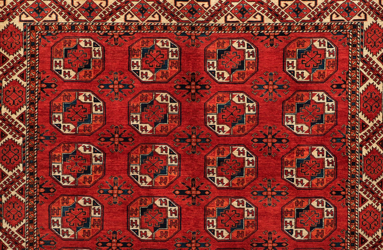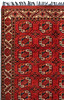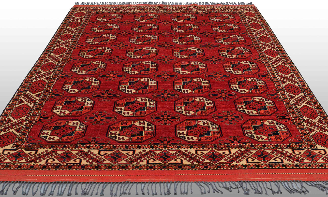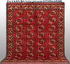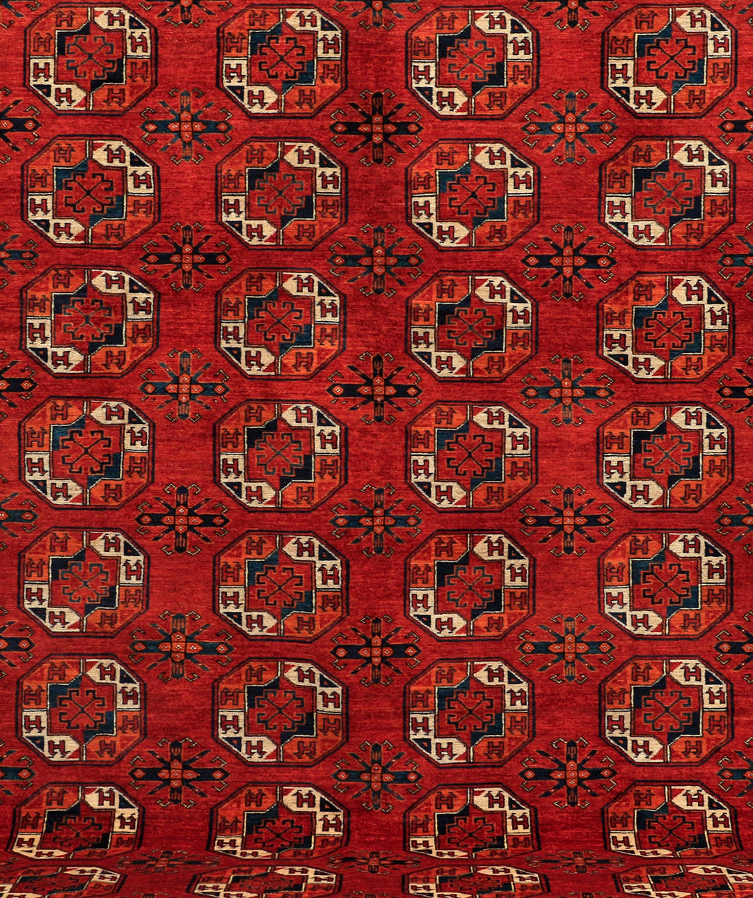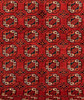 Turkeman with red background and repeated octogonal gull motifs in dark blue and beige. The border has a beige base color and geometric decor in red and dark blue. The bangs are made of wool and the warp is of wool.