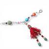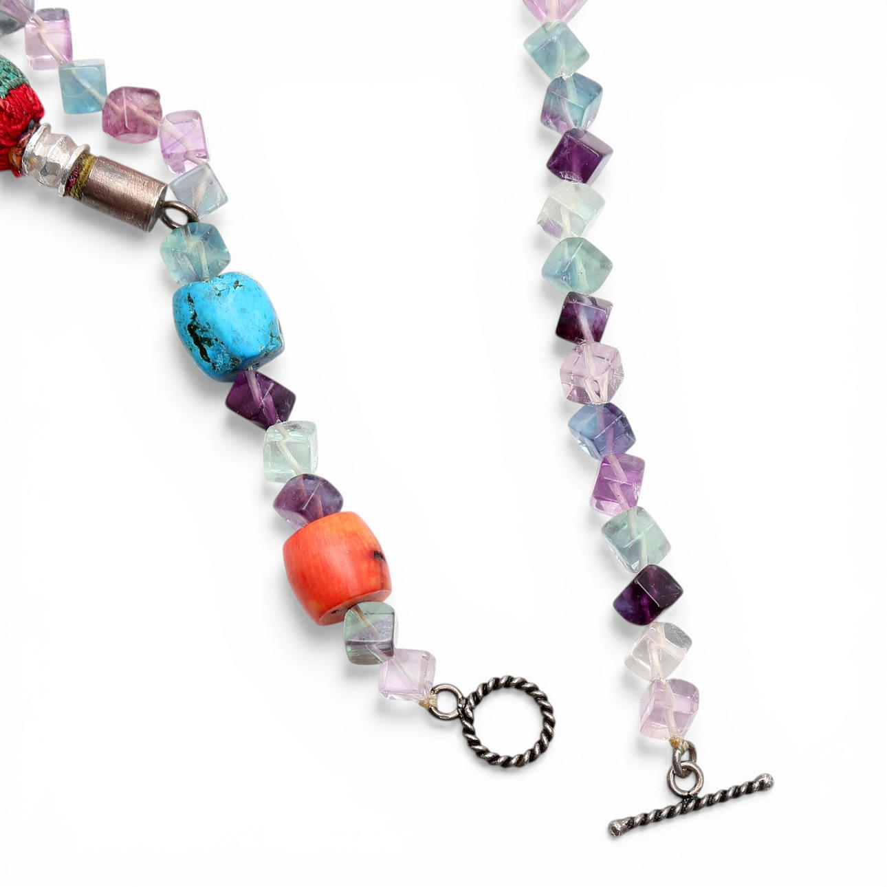 Silvery metal, quartz, fluorite, turquoise and coral. Central piece made of fabric and beads. 53 cm. 66 gr.