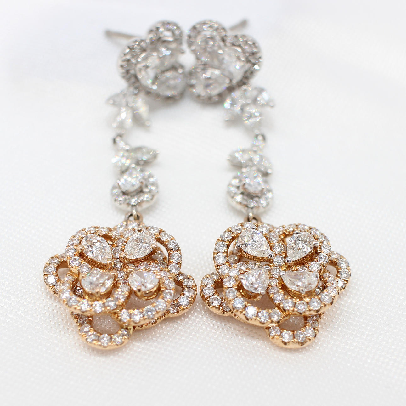 These earrings feature 234 individual natural diamonds in varying cuts (round brilliant, marquise and pear cut)