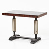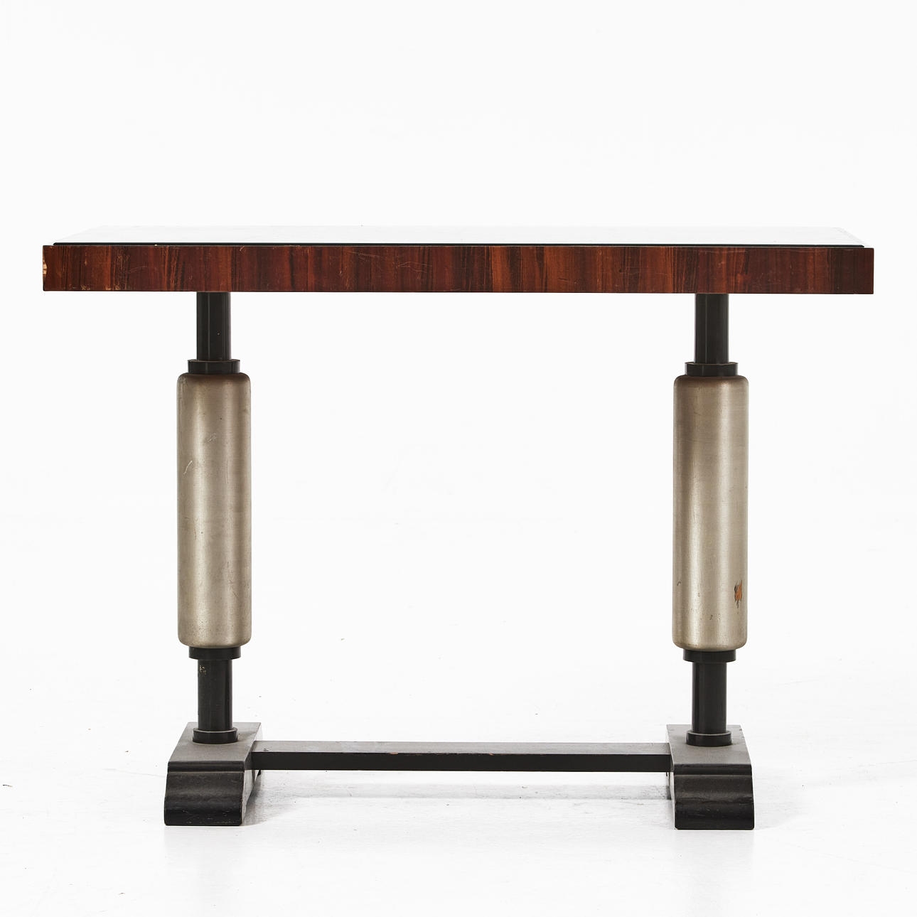 glass top, blackened and metal patinated frame, edge veneered jacaranda, height approx. 65, 90x52 cm.