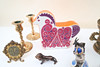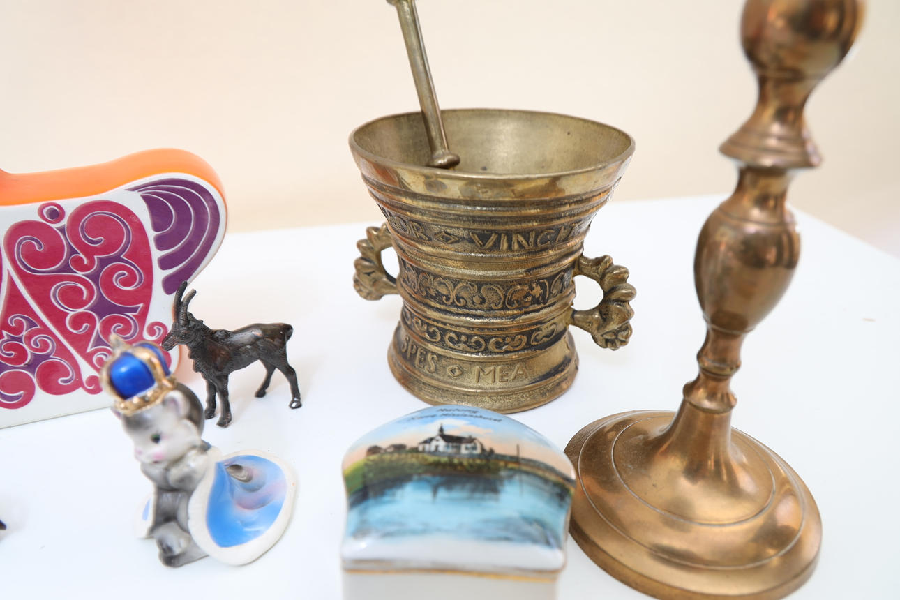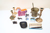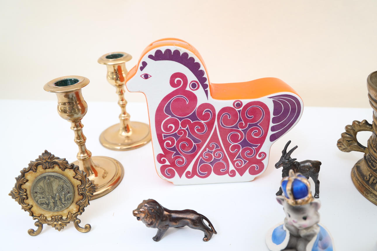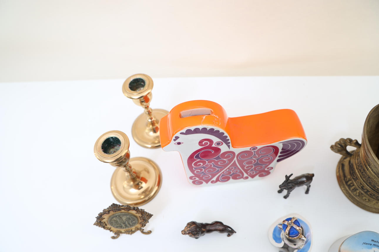 Money box England in the form of horse, Candlestick skultuna, fountain pen, sculptures in patinated metal. Maximum height 20cm.
