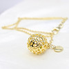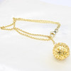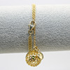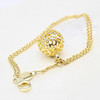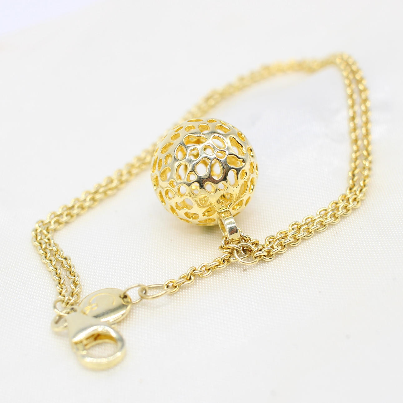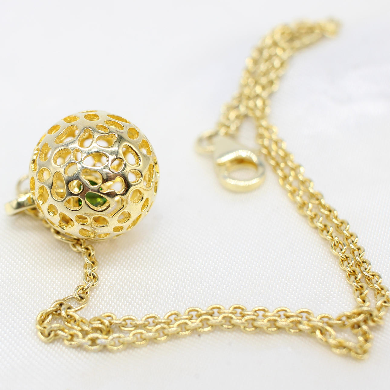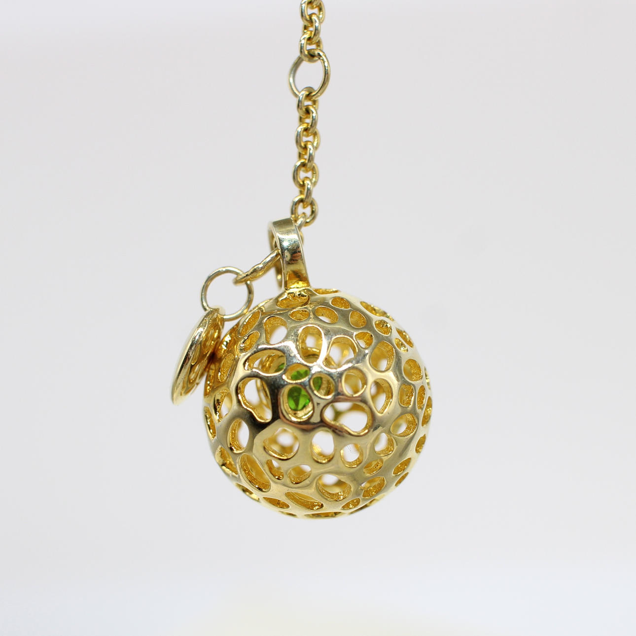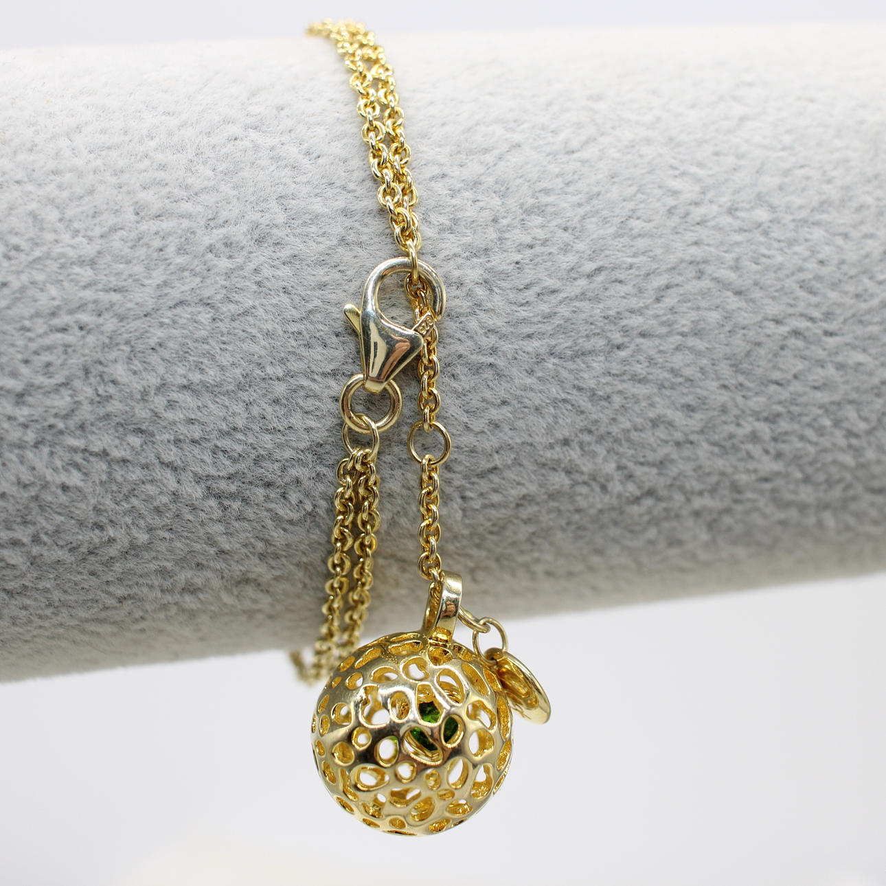 A gold plated silver (stamped 925) double chain bracelet with hollow ball charm and green cubic zirconia heart gem inside
