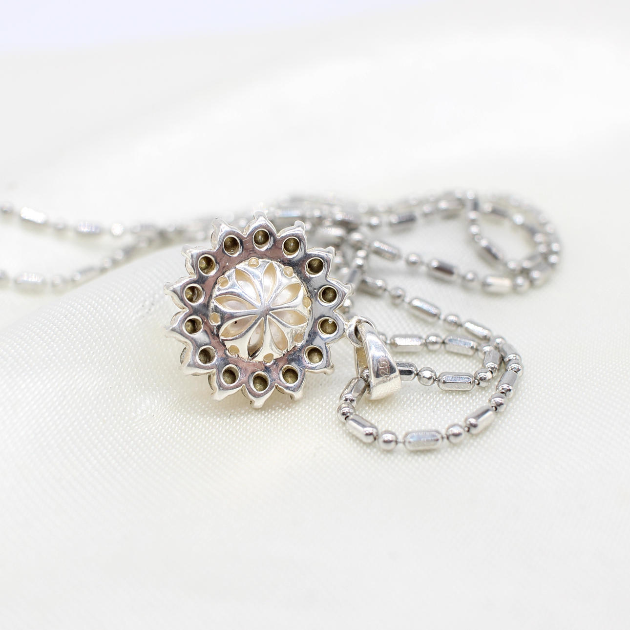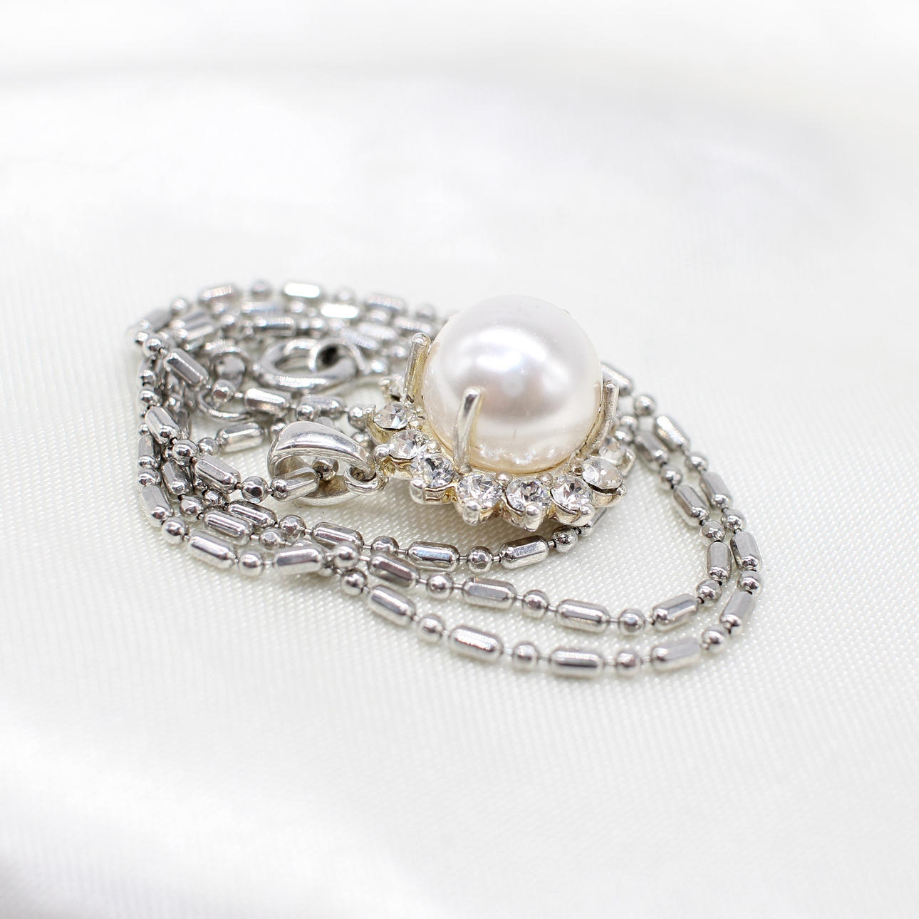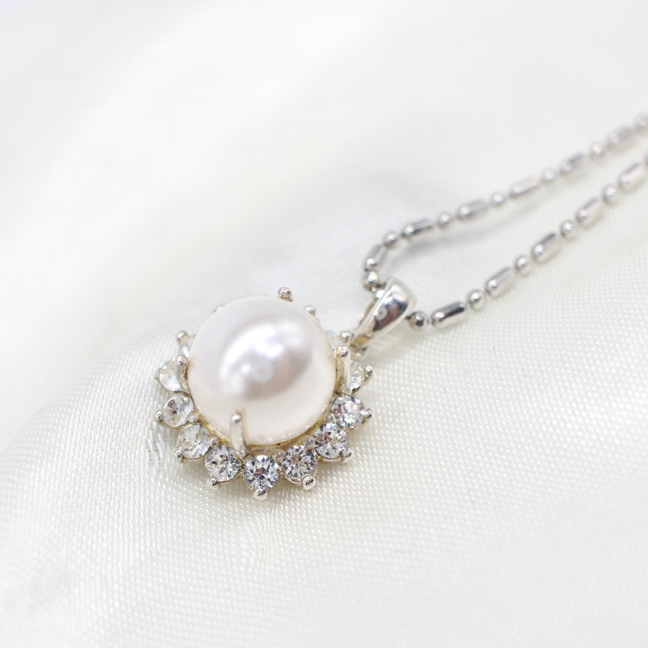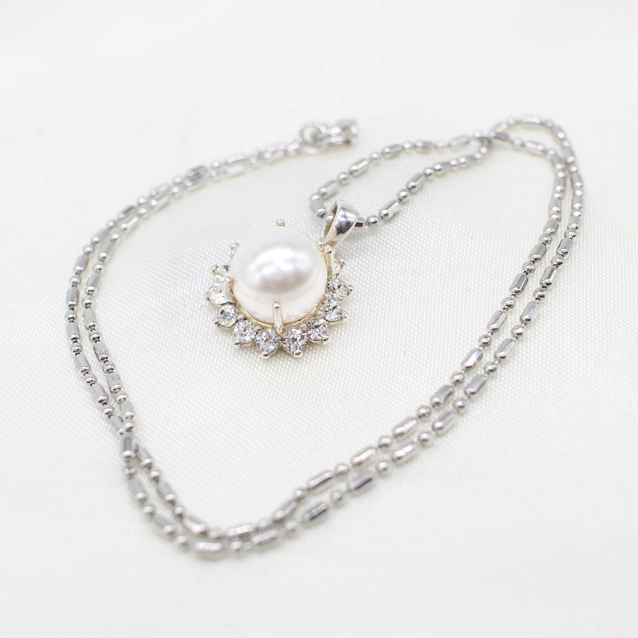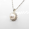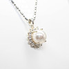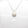 A silver (stamped 925) necklace set with a simulated pearl surrounded by white rhinestones.