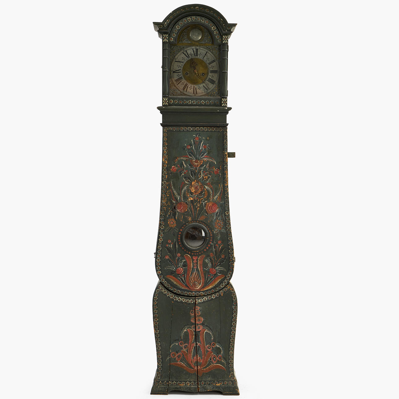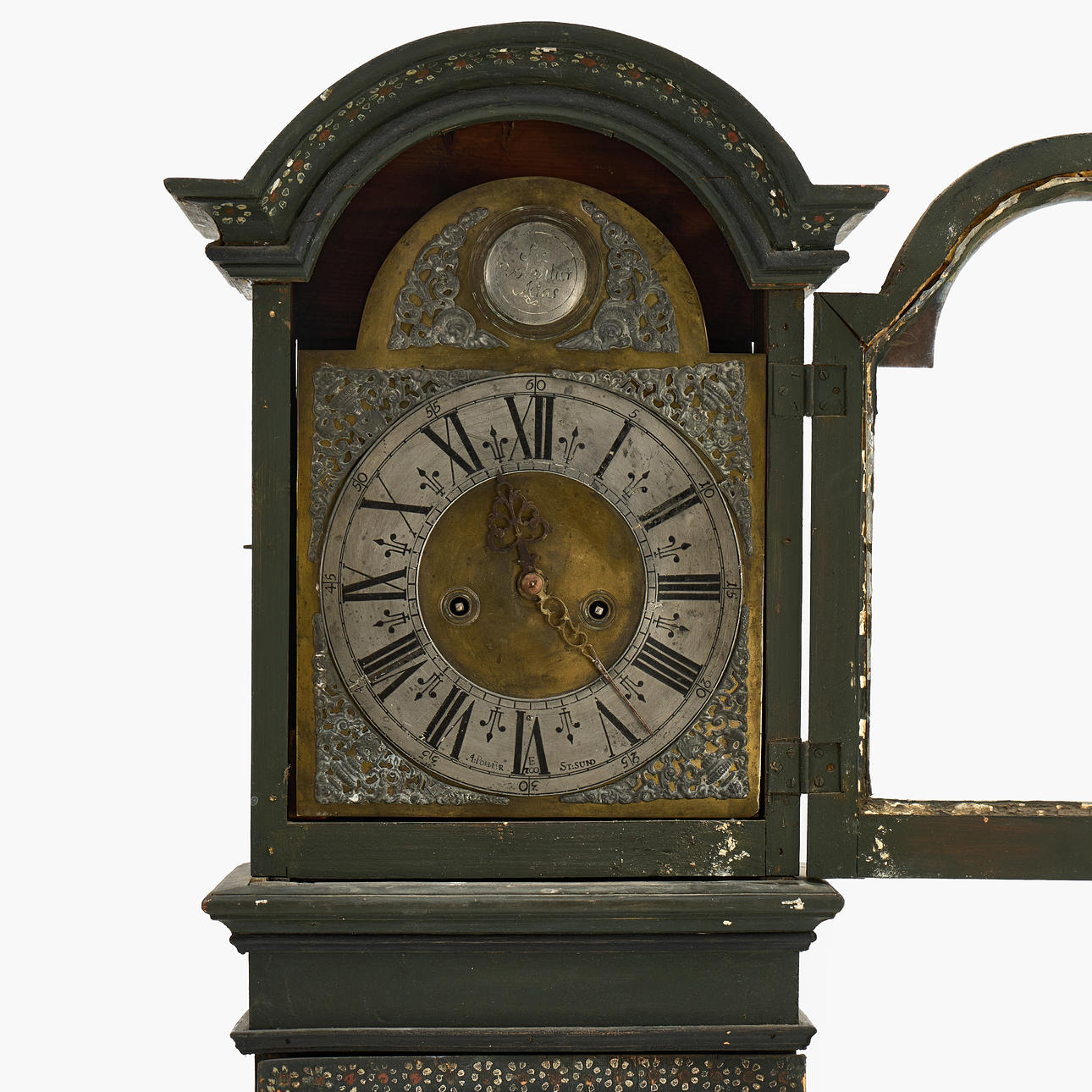 A 1730s floor clock by Anders Polhammar, Stjärnsund, Dalarna. Signed clockwork. Case with original painting.