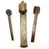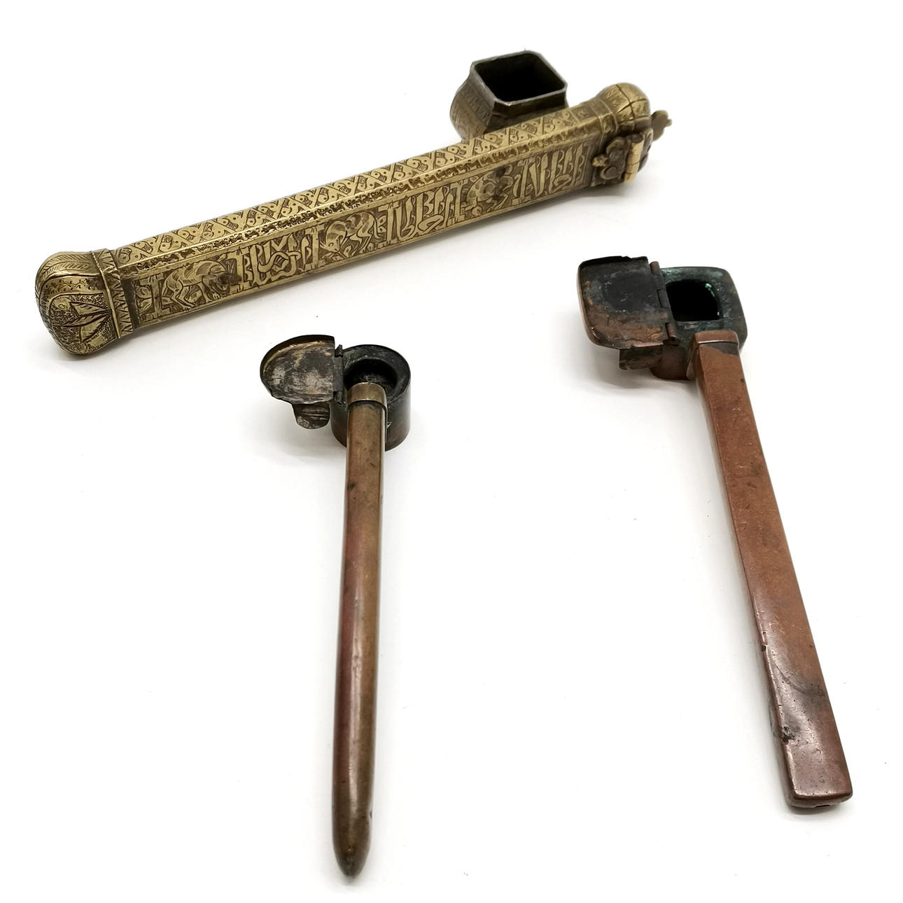 3 x antique travelling scribes metal boxes - largest brass 25cm has script and lacks lid to inkwell.