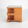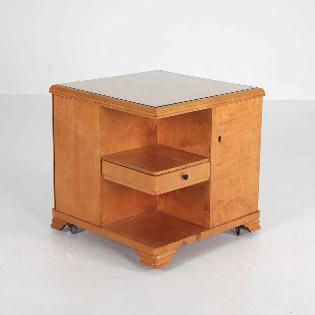 Smoking table with cupboard and drawer, loose glass top. Bonat hardwood. Rollable with wheels underneath.