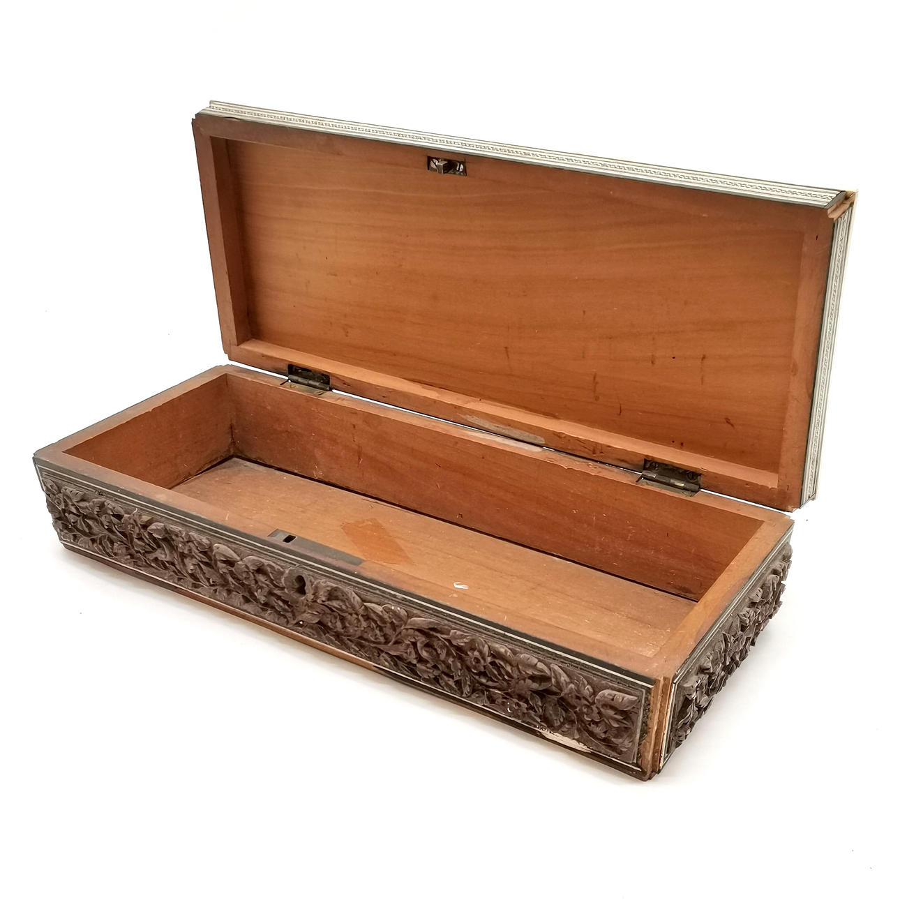 Antique hand carved Indian box with geometric detail and triple wreath detail to hinged lid - 30.5cm x 13cm x 8.5cm high.