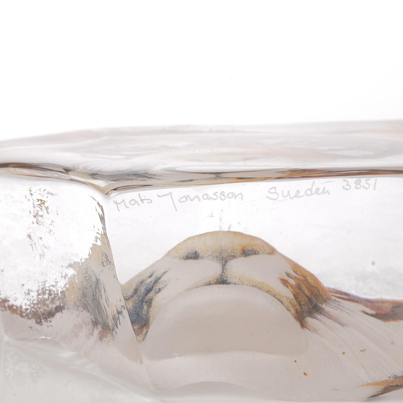 MATS JONASSON. Glass block with Tiger, Painted lock, signed.