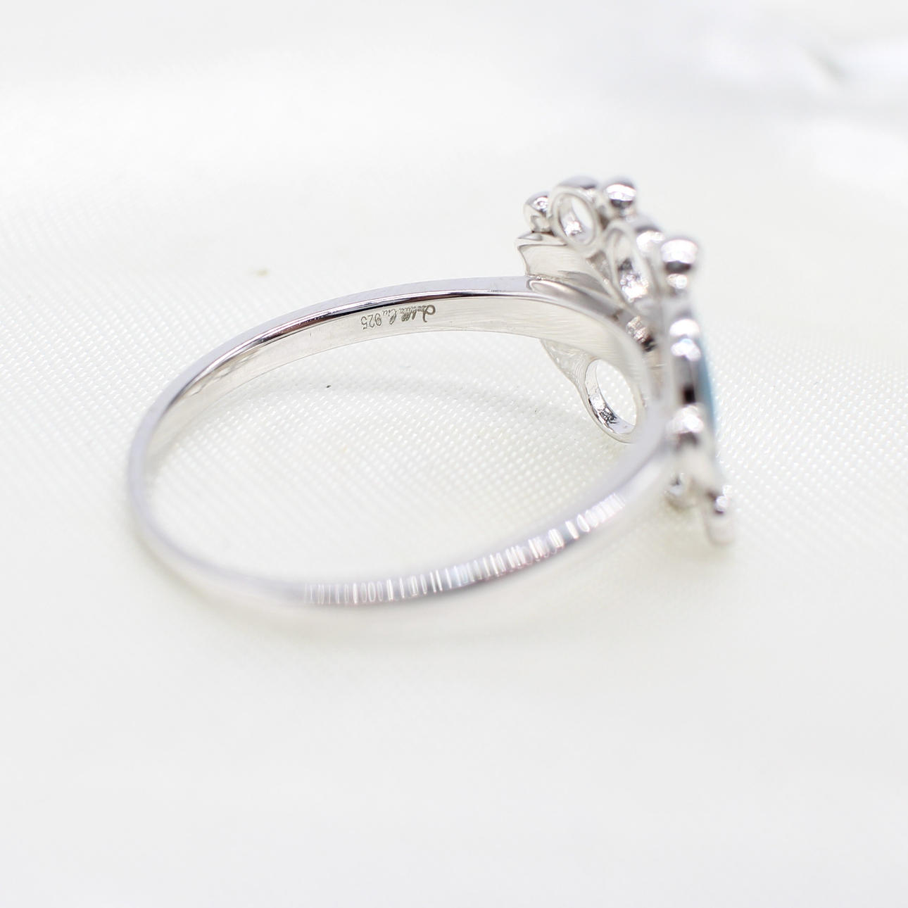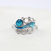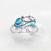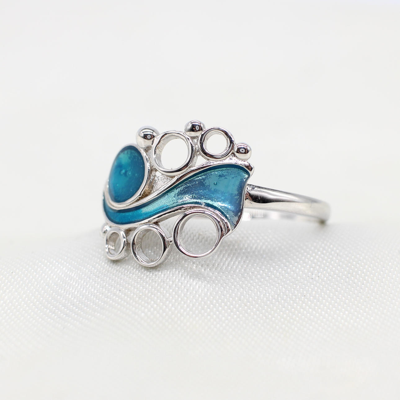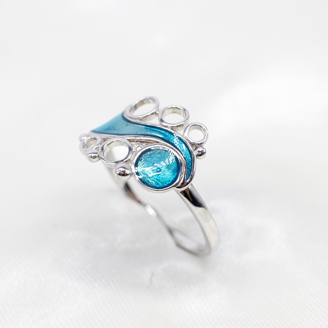 A large size, silver (stamped 925) wave style ring set with iridescent turquoise plique a jour style enamel