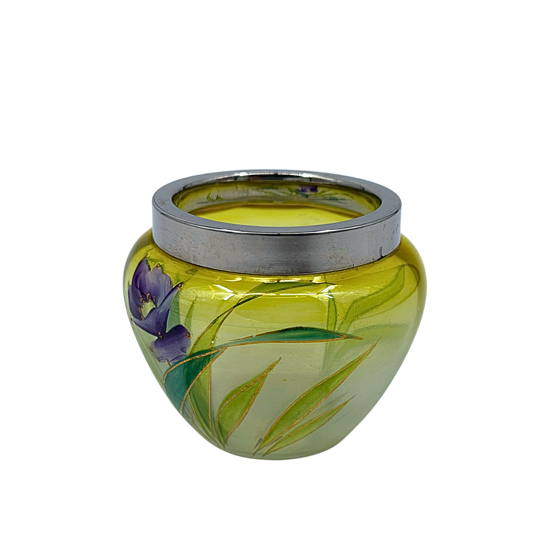 Miniature glass vase with metal ring. Decorated with floral design