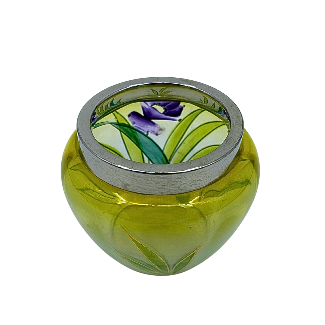 4939471. MINIATURE GLASS VASE WITH METAL RING.