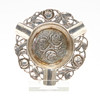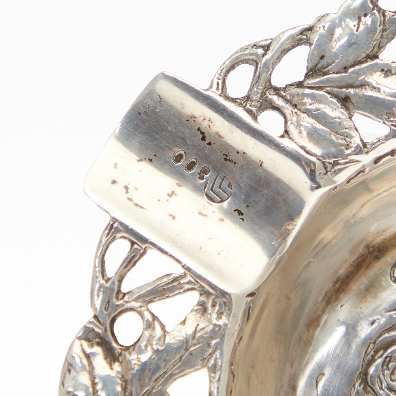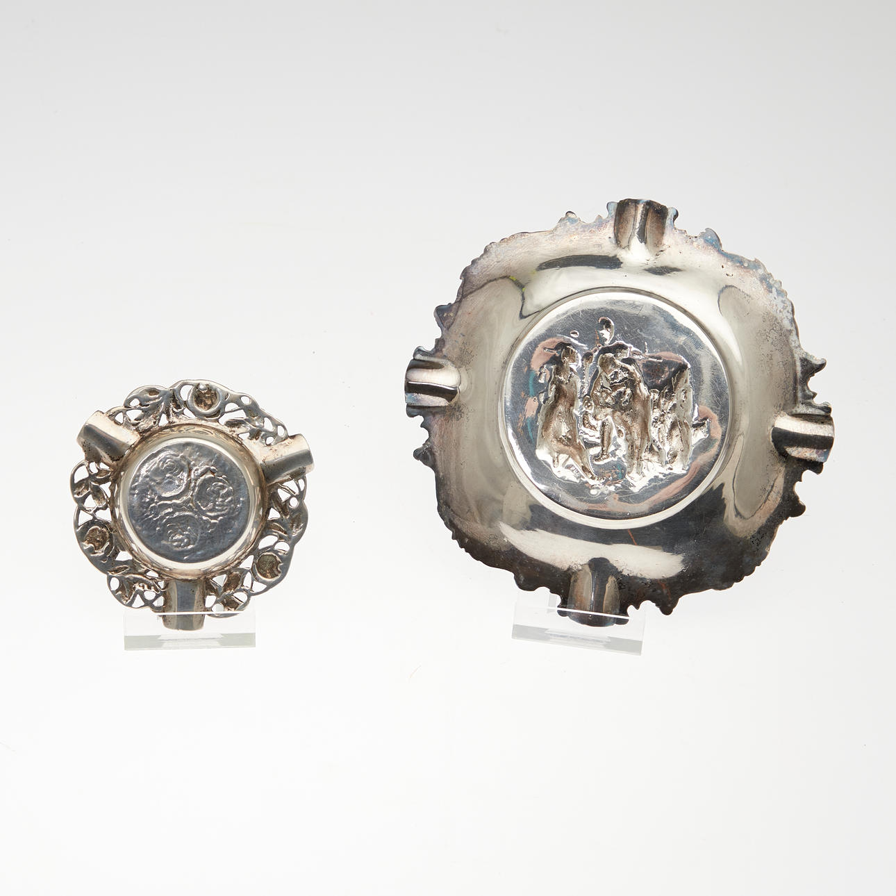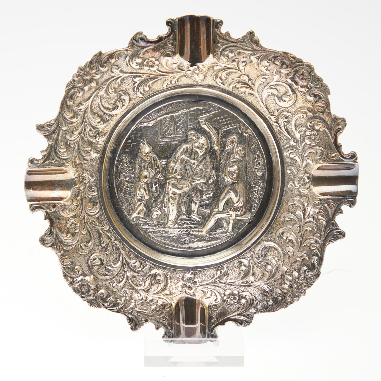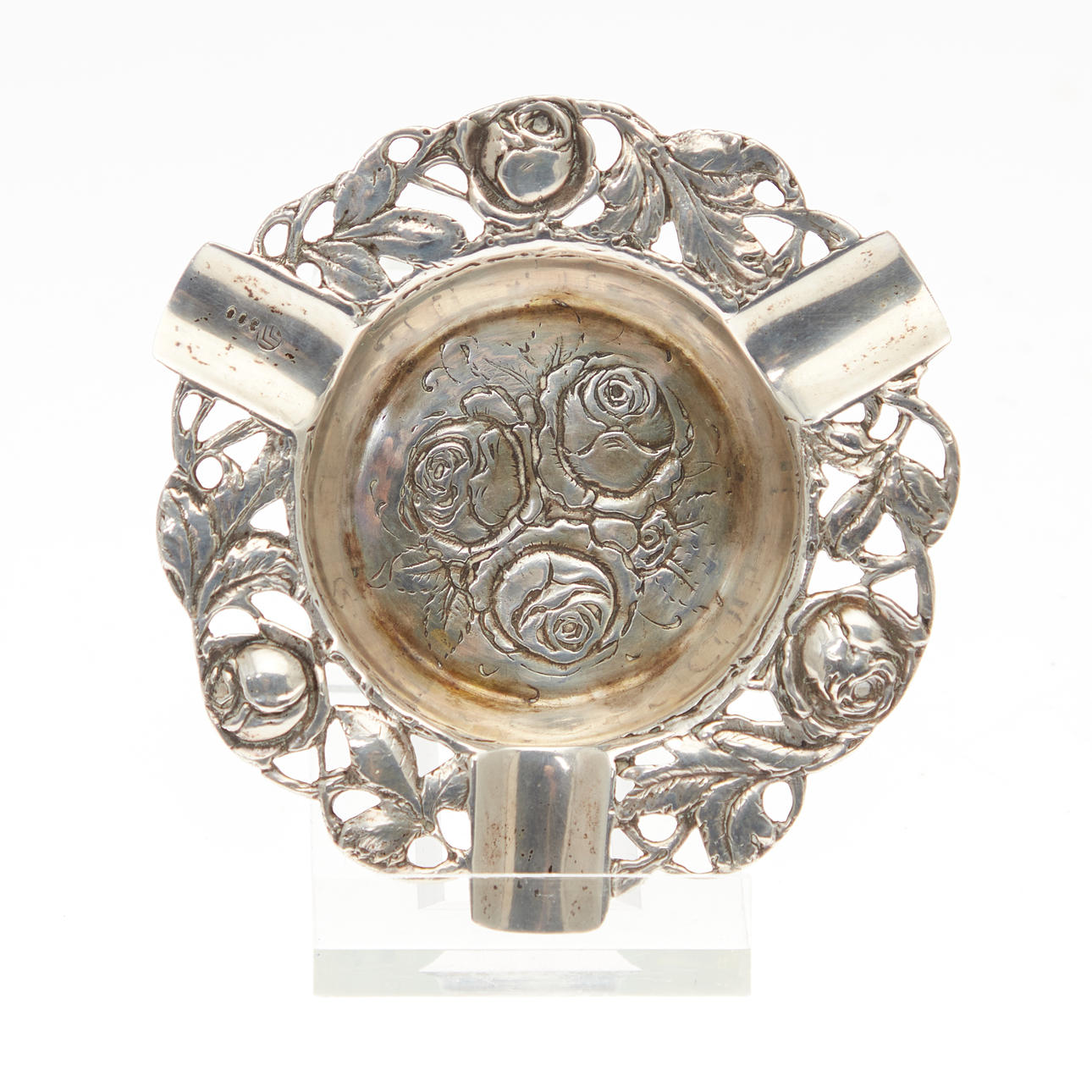 1 small ashtray with three cigarette shelves, floral, relief-like border ornament and a rose motif in the middle: h. 1.5 cm, diameter 8 cm, 31.94 g.
