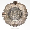 1 large ashtray with four cigarette shelves, floral, relief-like border ornament and in the middle a circular relief of a figurative scene: H. 2 cm, Ø 13.5 cm, 130.31 g,