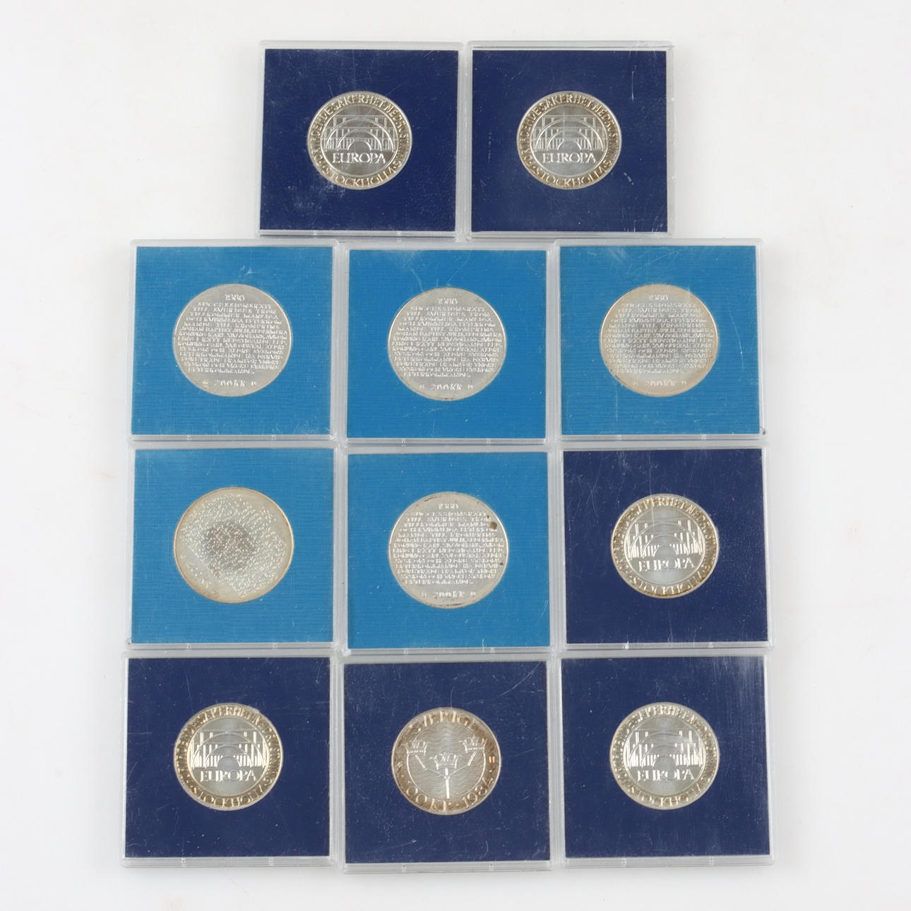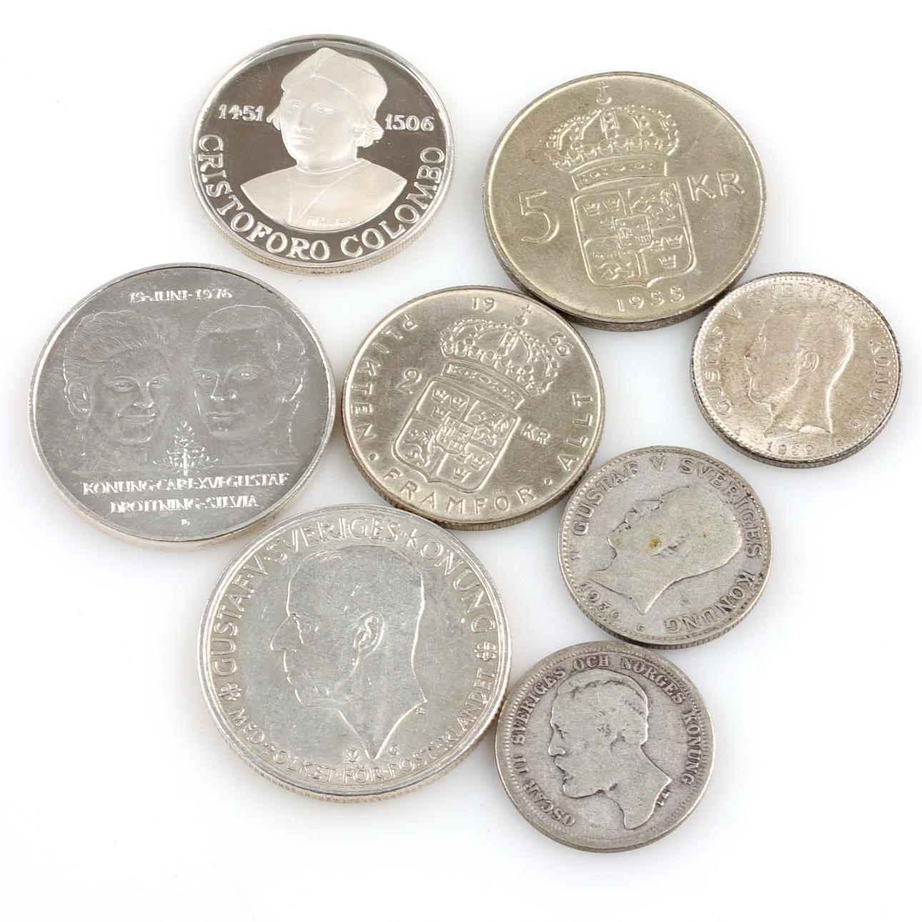 5,200 kr in 1980. 6,100 kr in 1984. 1 50 kr in 1976. 1 5 kr 1935. 1 5 kr 1955. 1 2 kr 1966. 3 1 kr 1884 - 1932. 1 commemorative coin, Chrisoforo Colombo 1451-1506, Sterling silver, diameter 32 mm, weight 11 grams.