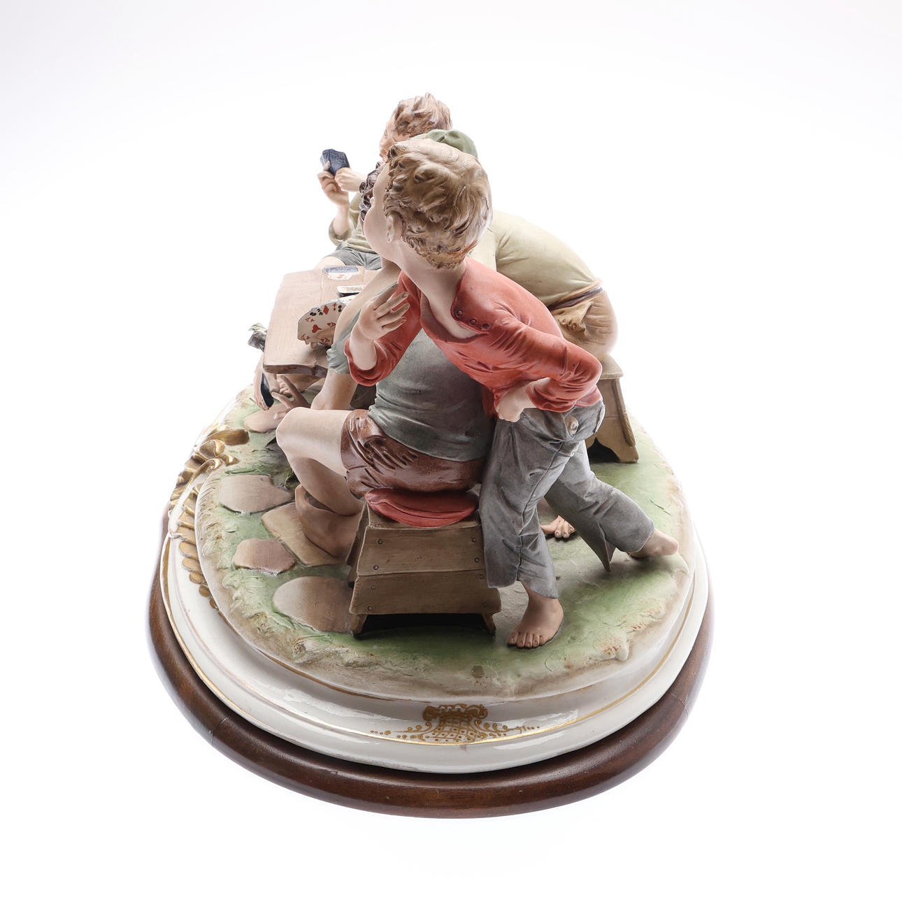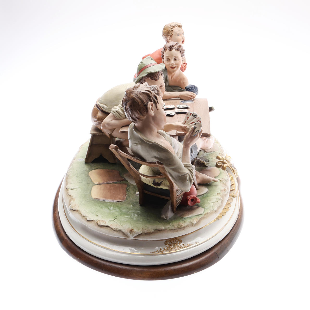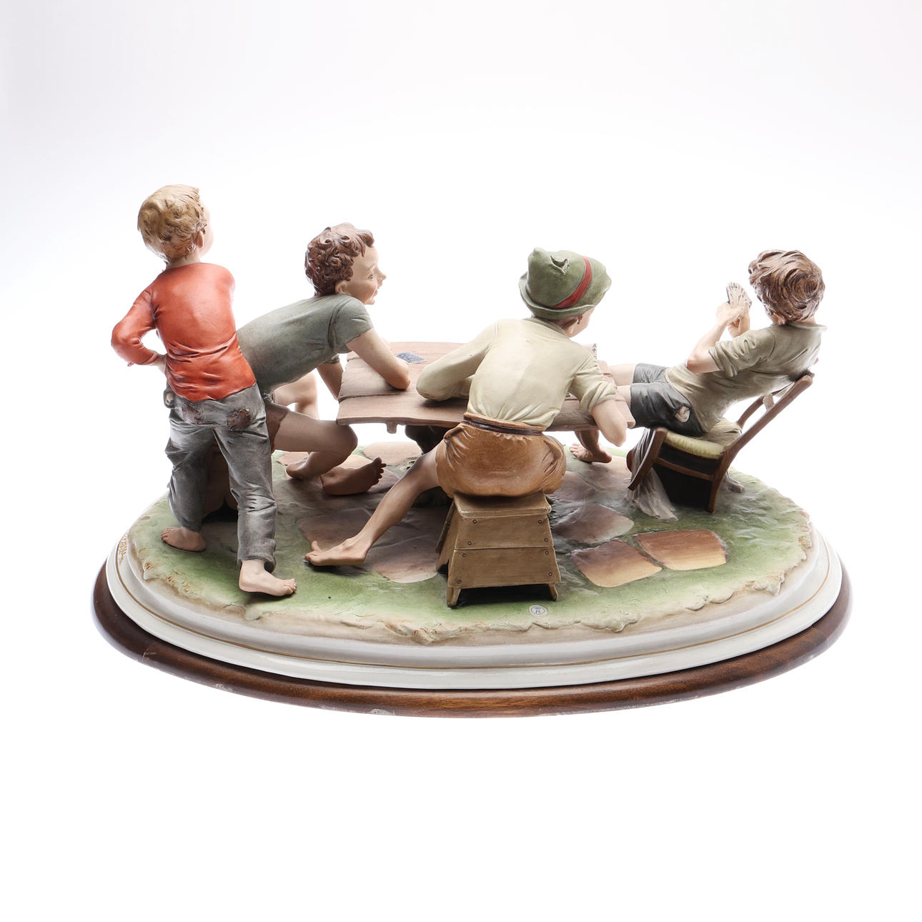 Depicting 4 boys playing cards, modelled by Bruno Merli, signed on an oval wooden base, W.56.5cm overall.