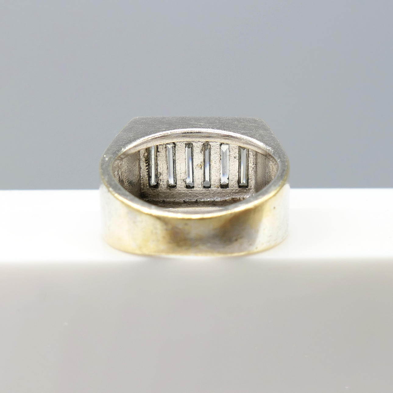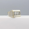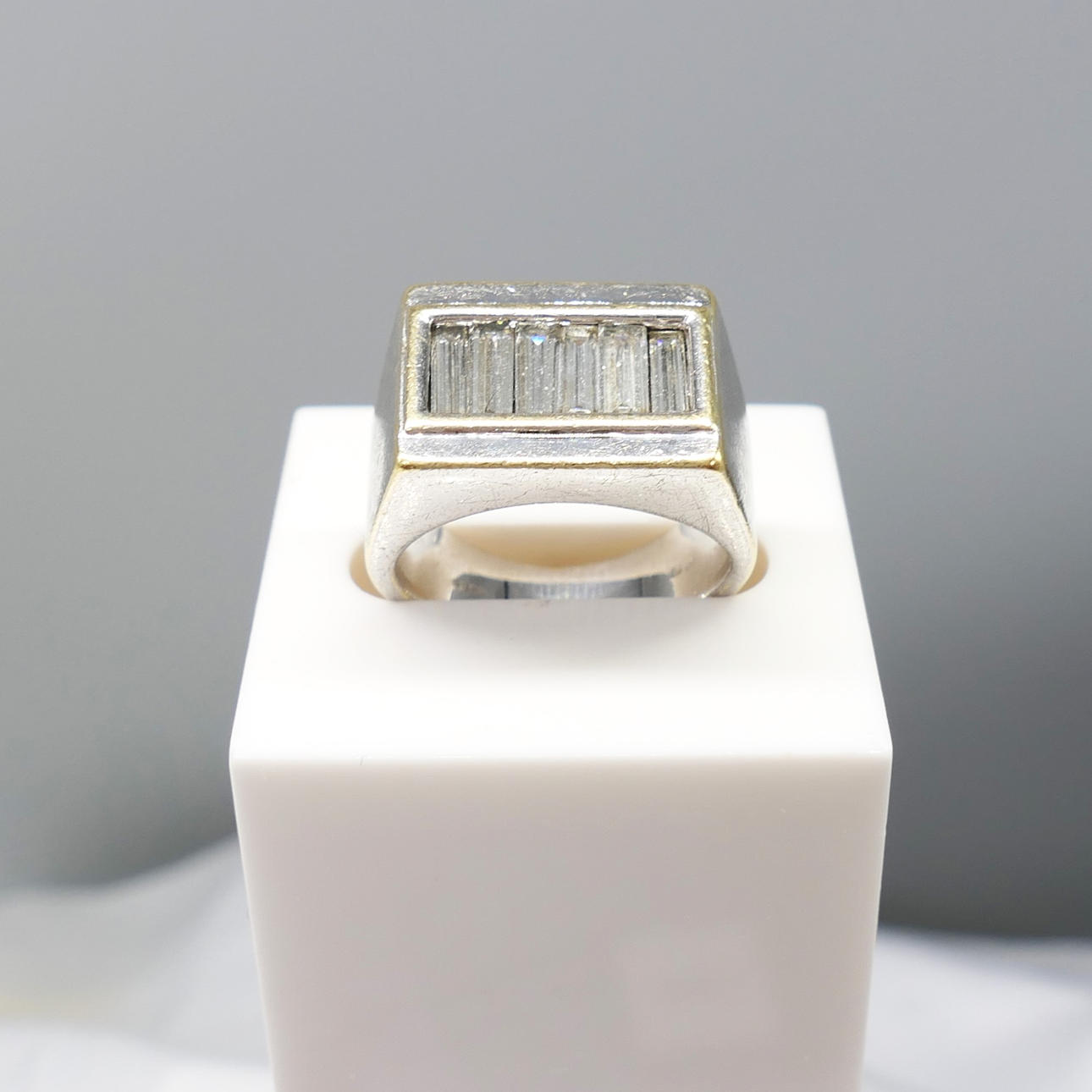 An 18k white gold chunky gent's style ring set with approx 1.25 carats baguette-cut diamonds, in a small ring size