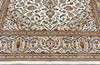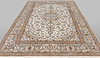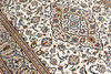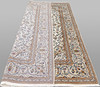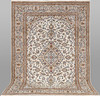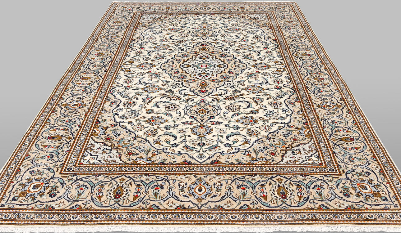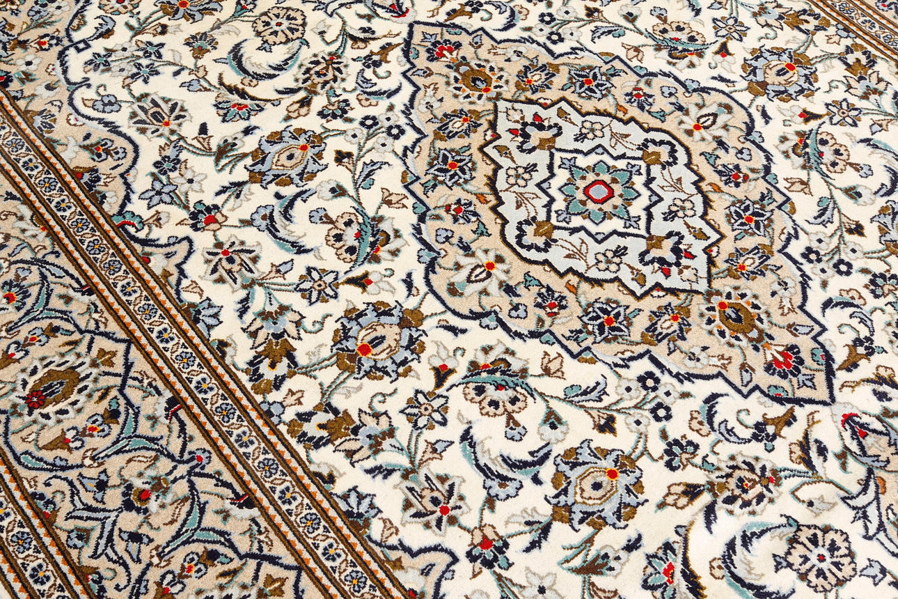 Keshan with bright bottom color and a centrally placed medallion with details in blue, beige and red. The center field is covered in floral ornamentation, palmettes and arabesques in similar shades, and the corner portions follow the same color scheme as the medallion. The border has a beige bottom and decor of palm branches. The forelock is made of wool and the warp is of cotton.