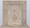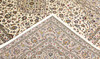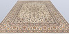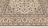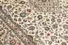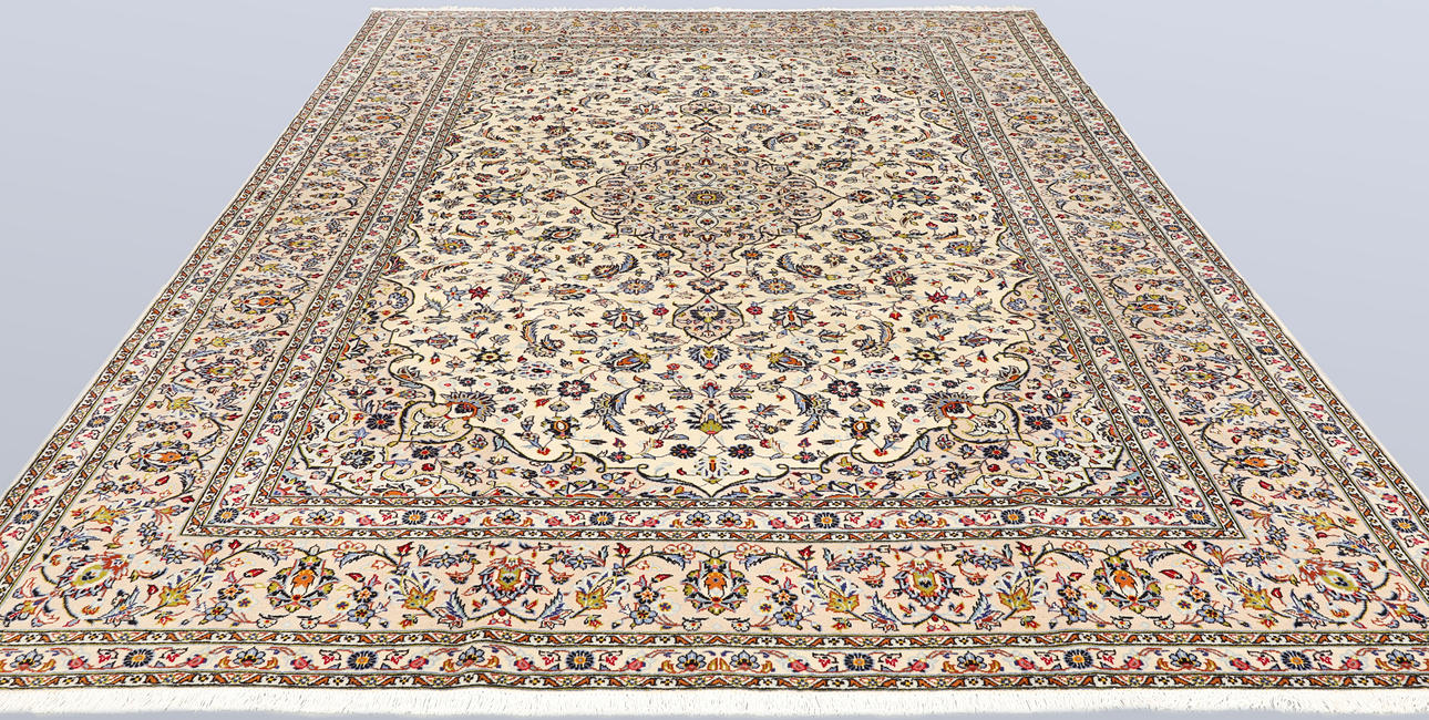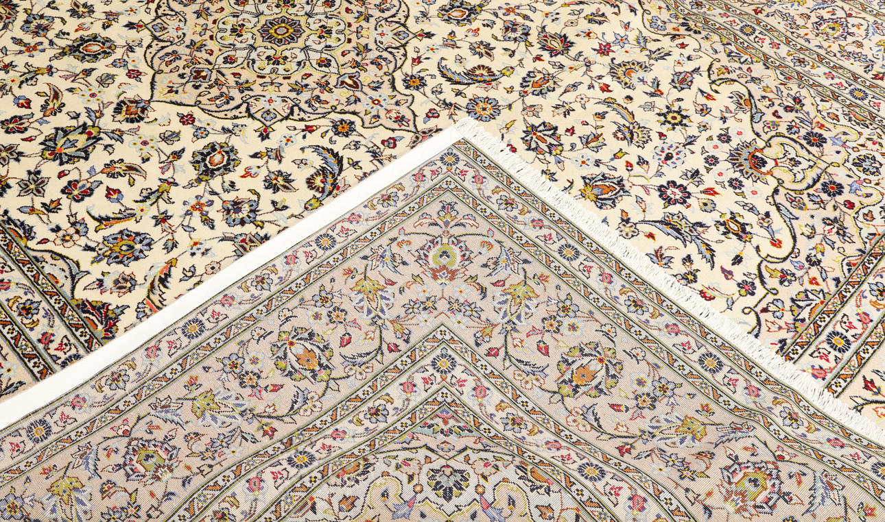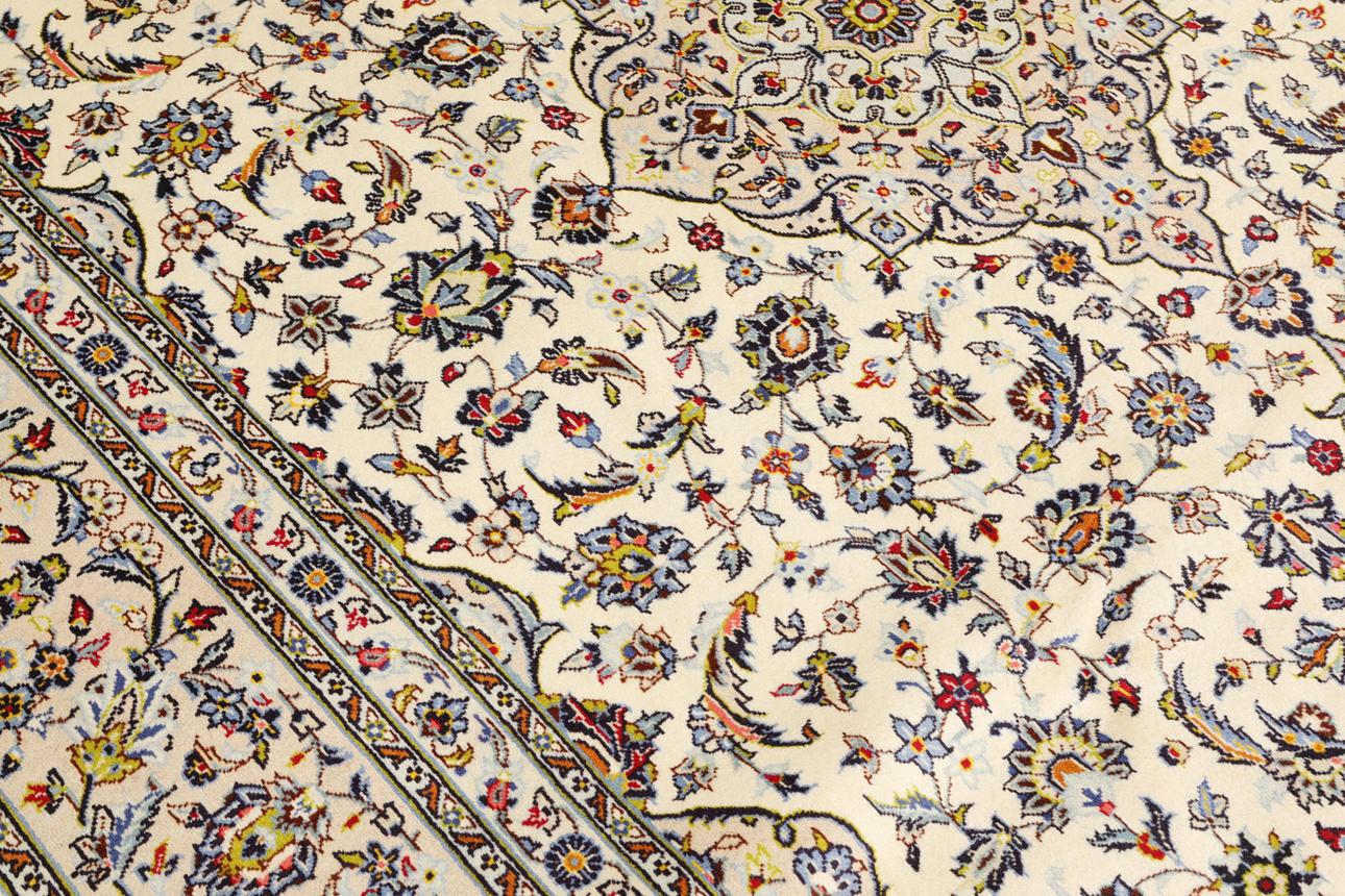 Keshan with bright bottom color and a centrally placed medallion with details in blue, beige and red. The center field is covered in floral ornamentation, palmettes and arabesques in similar shades, and the corner portions follow the same color scheme as the medallion. The border has a beige bottom and decor of palm branches. The forelock is made of wool and the warp is of cotton.