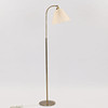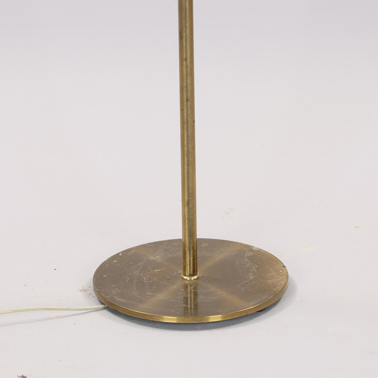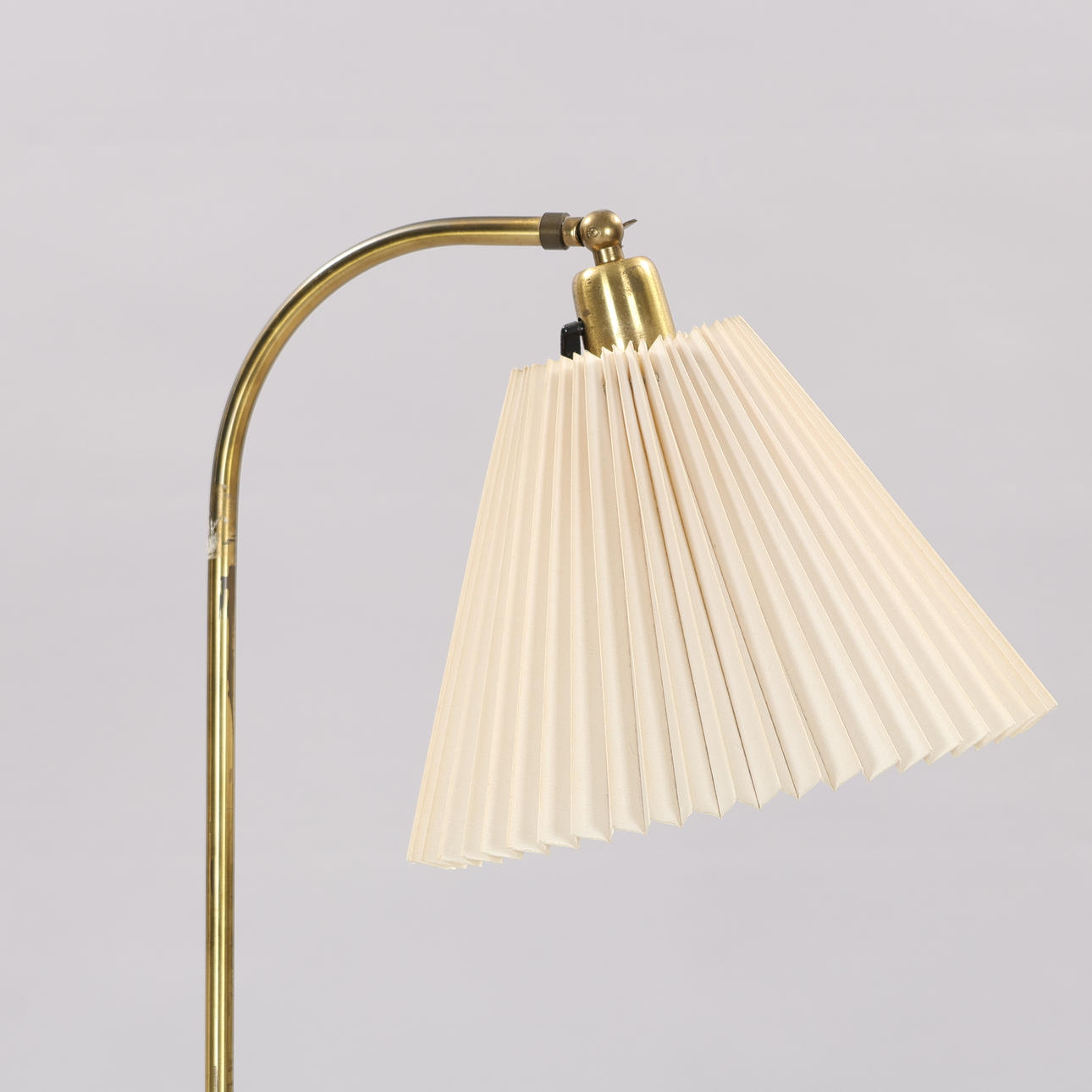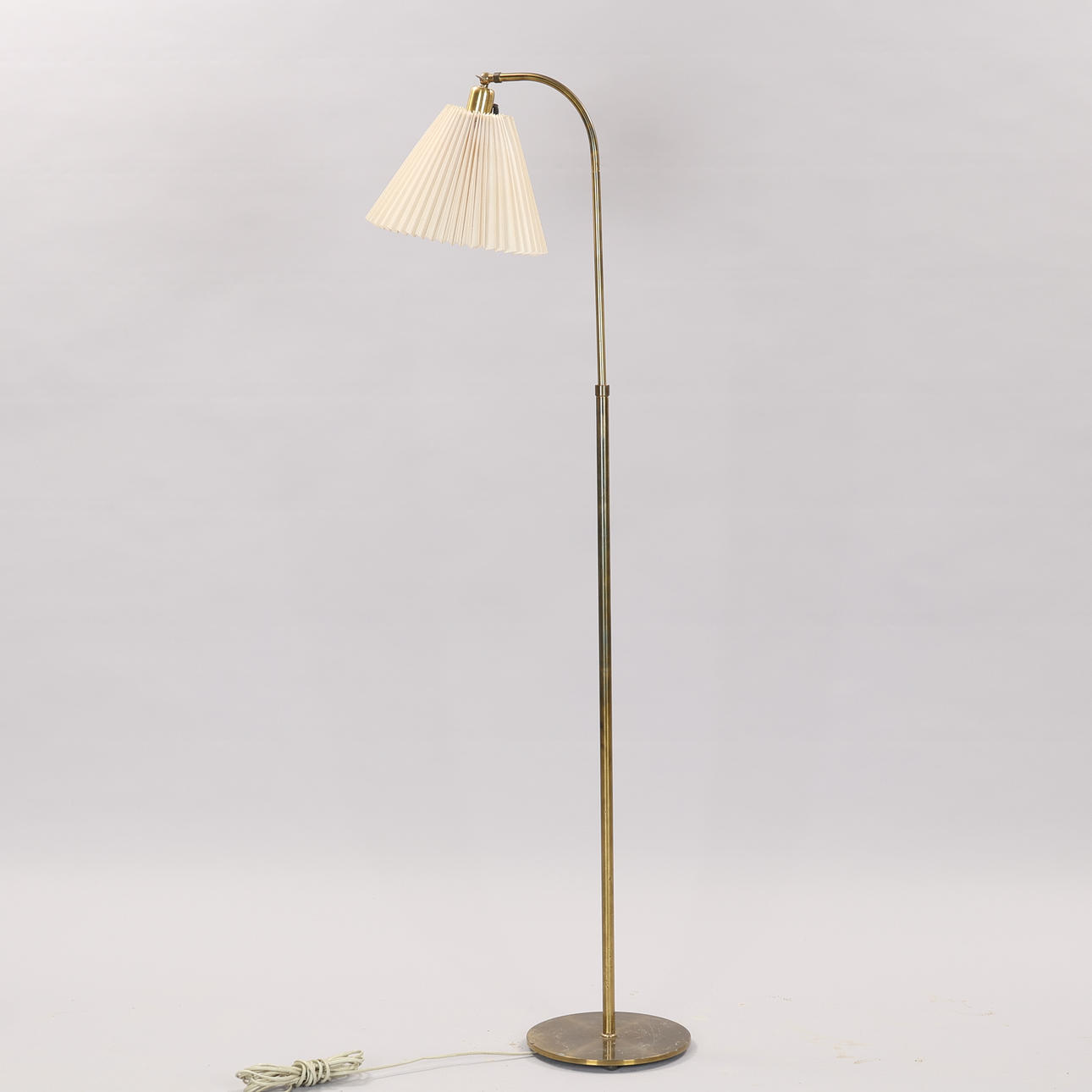 Brass floor lamp on round bass with screen made of pleated, white plastic. Adjustable height and screen. Unmarked, but presumably made by a Danish lamp manufacturer.