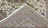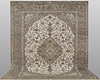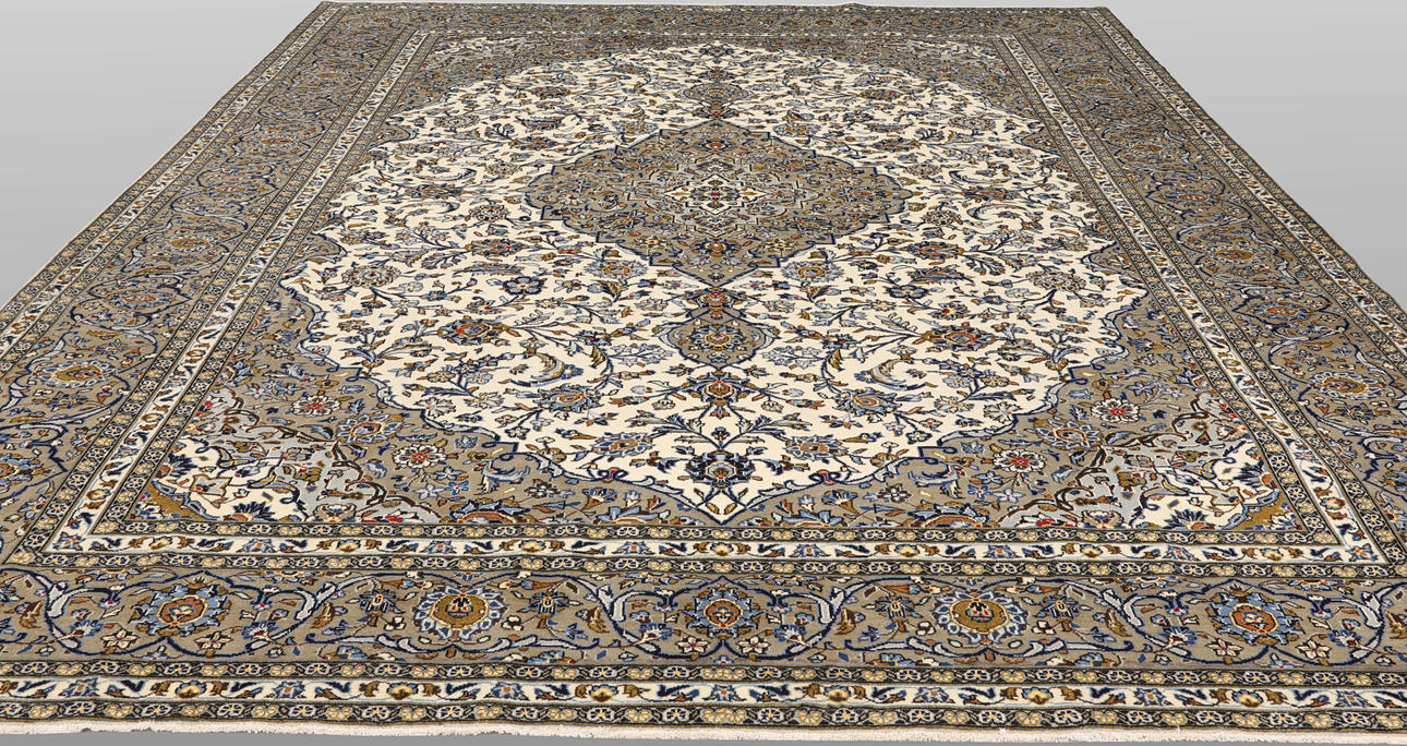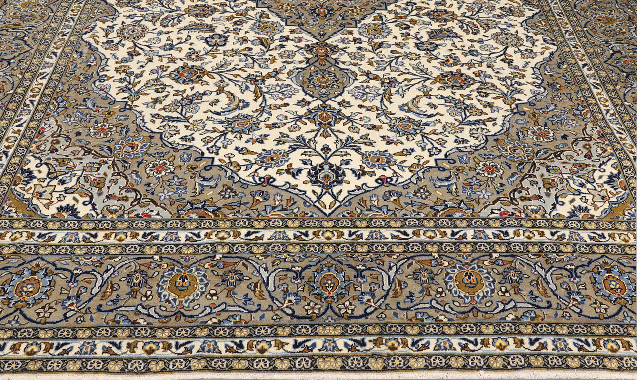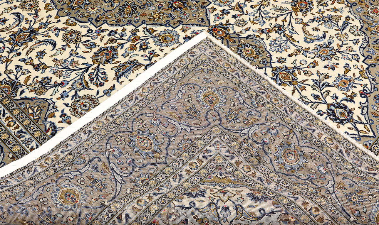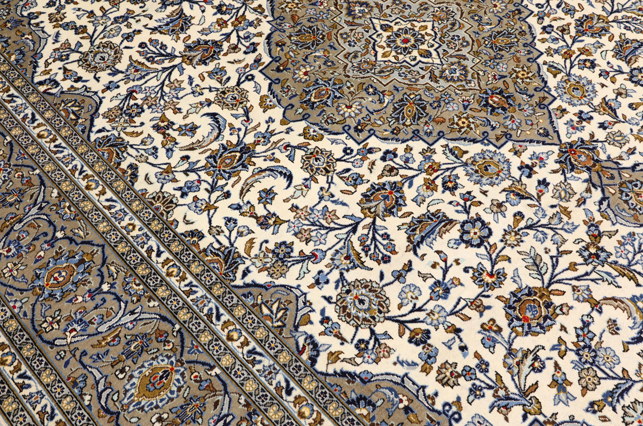 Keshan with light bottom color and a centrally placed medallion in a dark beige shade and details in blue and red. The center field is covered in floral ornamentation, palmettes and arabesques in similar shades, and the corner portions follow the same color scheme as the medallion. The bottom color of the border has the same shade of dark beige and decor of palm branches. The forelock is made of wool and the warp is of cotton.