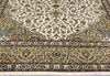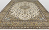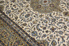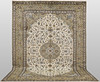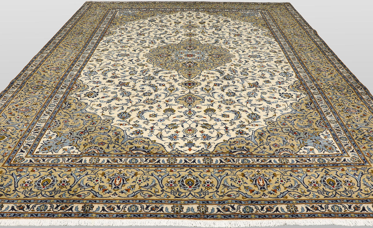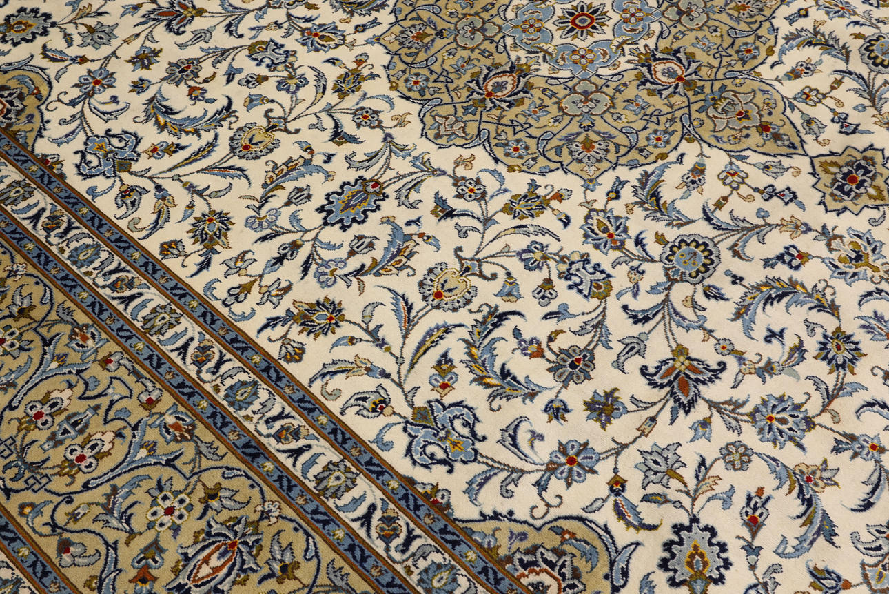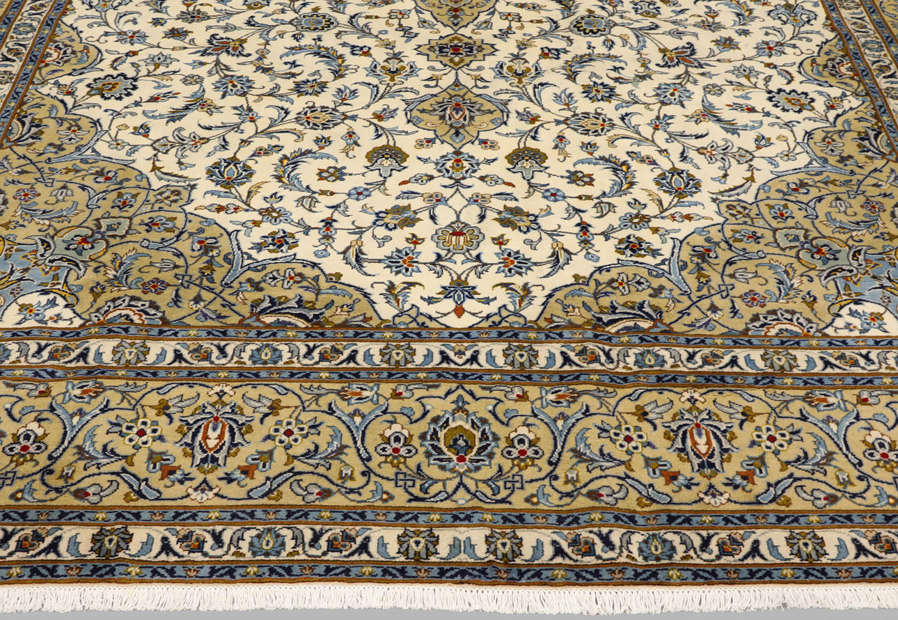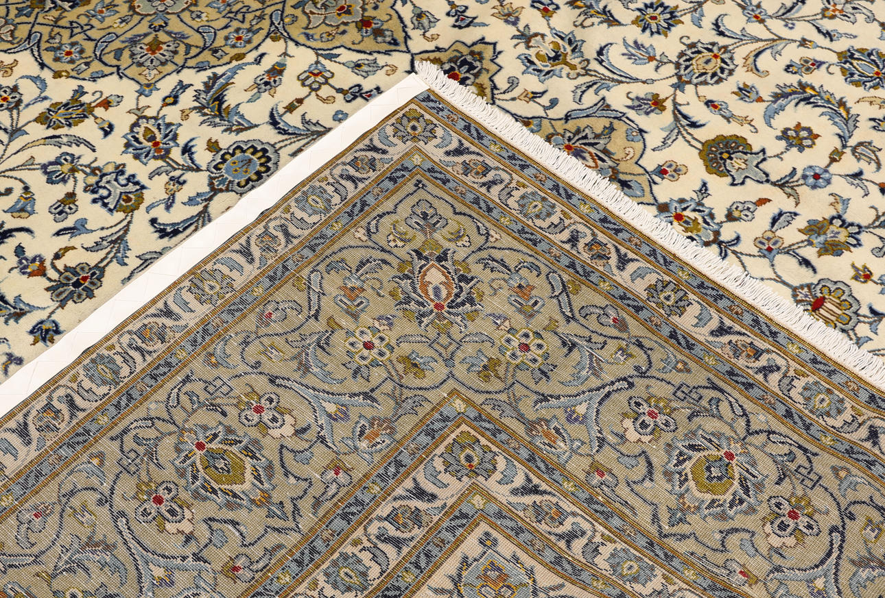 Keshan with bright bottom color and a centrally placed medallion in beige and details in blue and red. The center field is covered in floral ornamentation, palmettes and arabesques in similar shades, and the corner portions follow the same color scheme as the medallion. The bottom color of the border has the same shade of beige and the decor of palmette tendrils. The forelock is made of wool and the warp is of cotton.