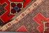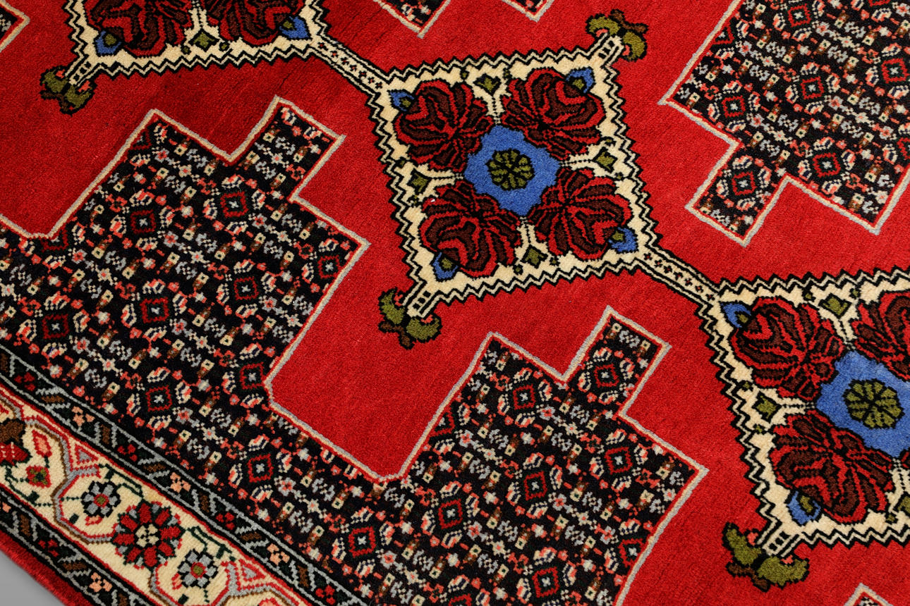 Senneh gallery model with dark bottom and a row of linked medallions in red, beige and blue. The center field is covered with dense small-patterned decor in geometric style that contrasts with the medallions. The border has bright bottom with stylized floral decor. The forelock is made of wool and the warp is of cotton.