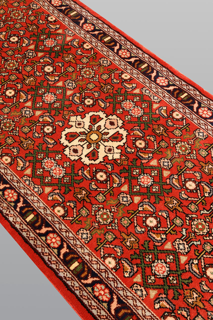 Hamadan gallery model with a red background and a centrally placed medallion in beige with details in green and dark blue. The center field is covered in Herati patterns as well as geometric and stylized plant decor in red, green, beige and blue. The border has a dark base with stylized floral motifs. The forelock is made of wool and the warp is of cotton.