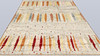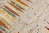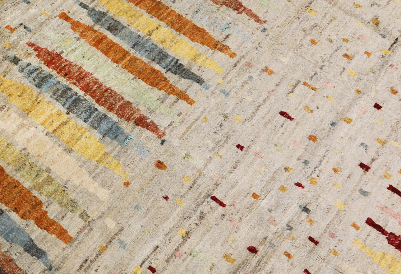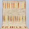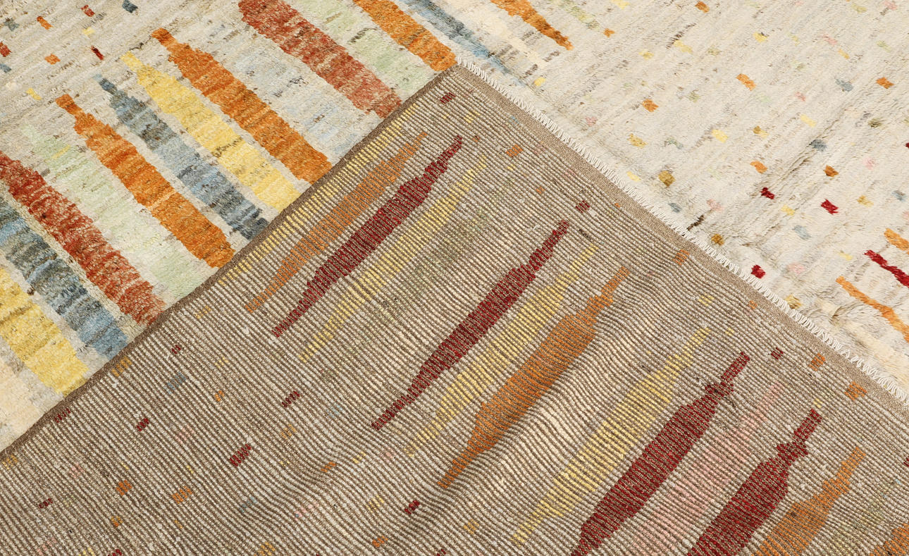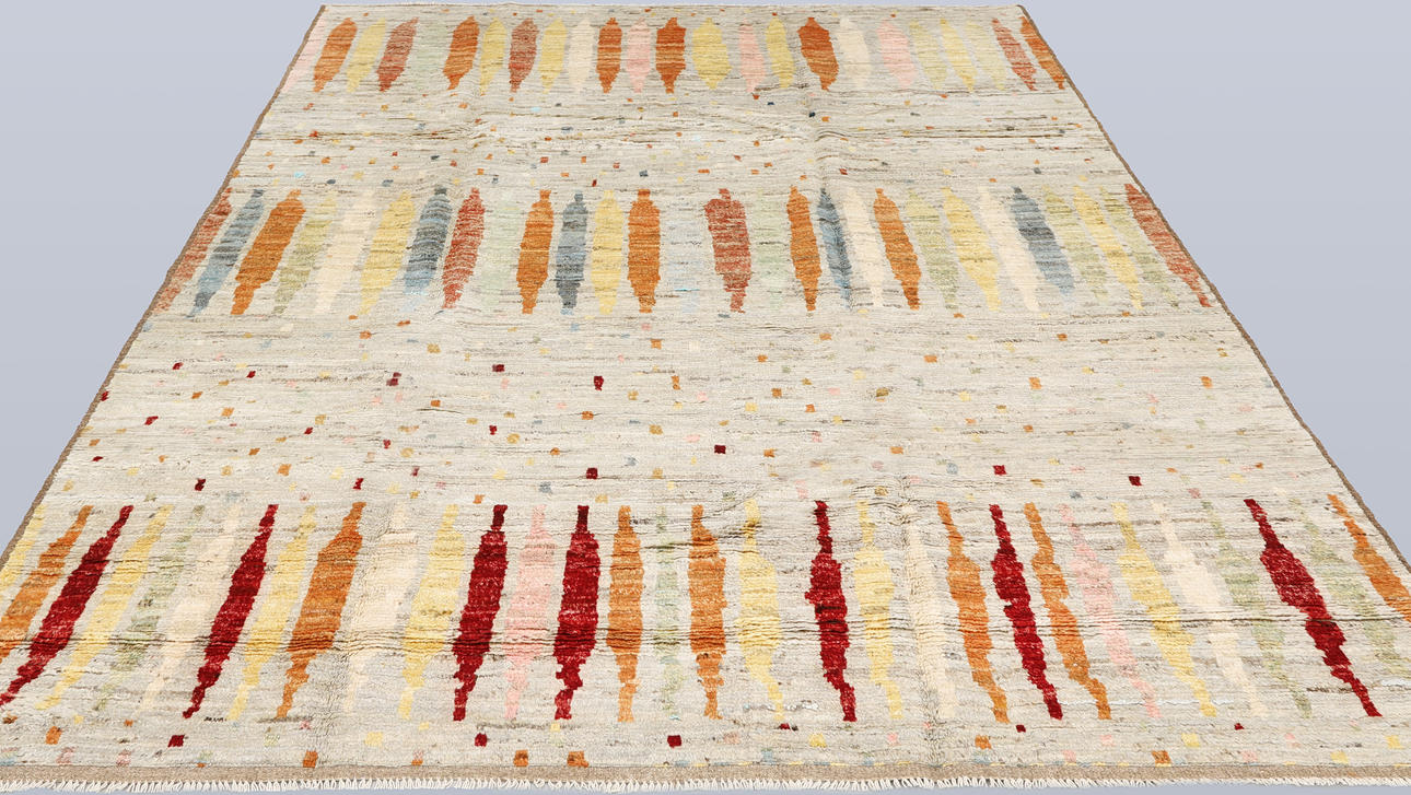 Morocco design with bright bottom and a field decorated with vertical, stylized motifs in red, yellow, orange and blue. Simple frame in a darker tone. The forelock is made of wool and the warp is of cotton.