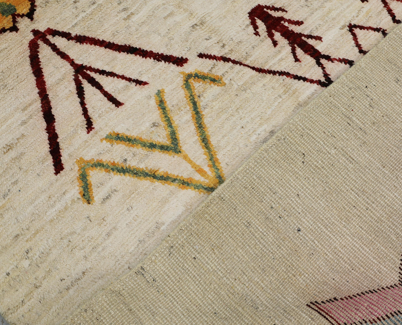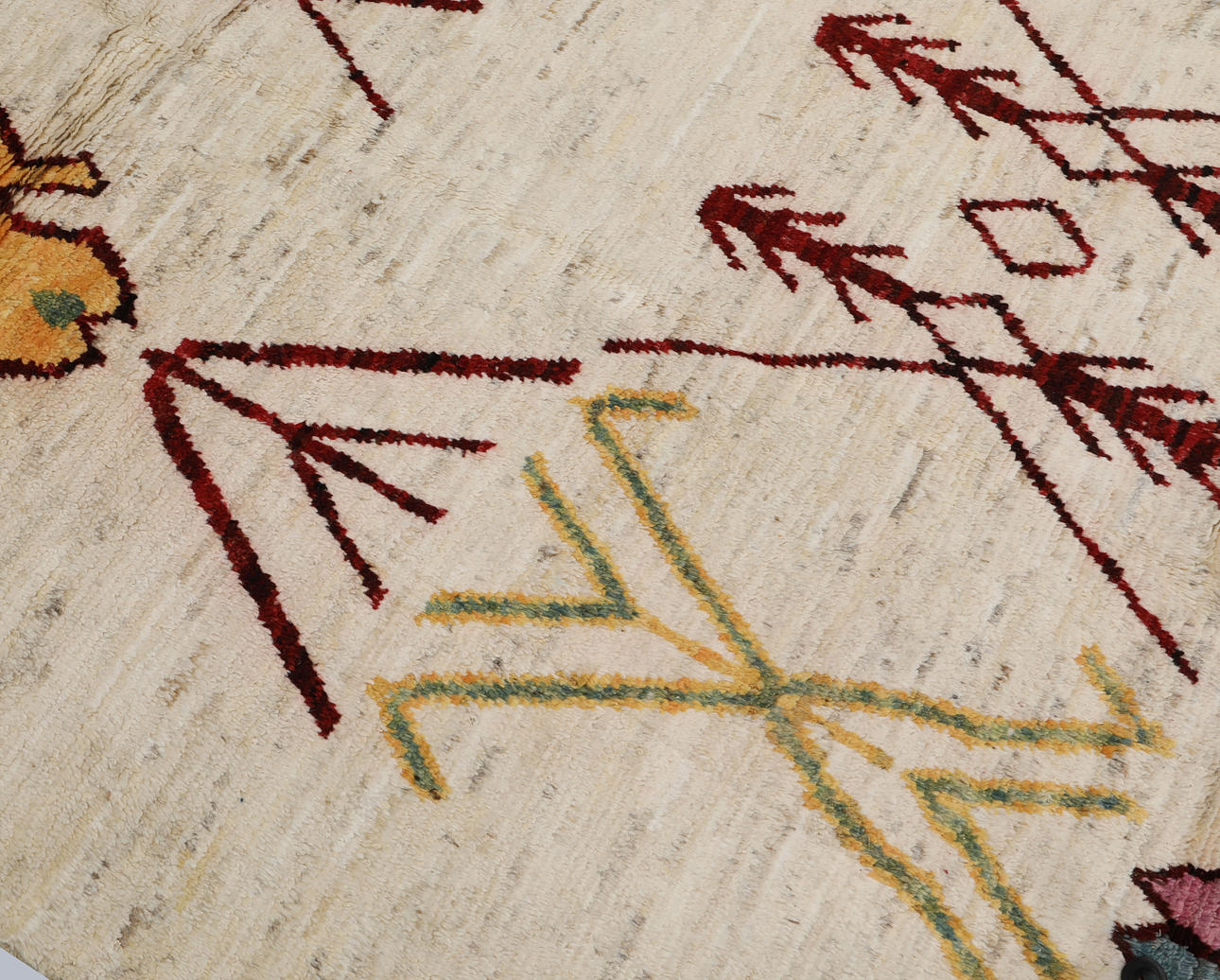 Morocco design with bright bottom and a center field decorated with large geometric motifs in red, yellow, pink and blue. The forelock is made of wool and the warp is of cotton.