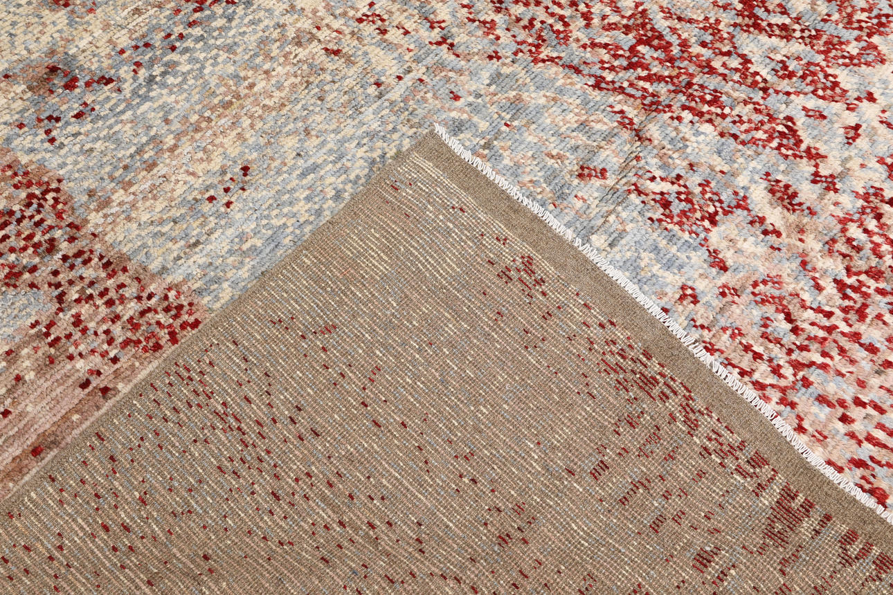 Morocco design with abstract, melange composition in red, beige and light blue with soft, irregular fields. The forelock is made of wool and the warp is of cotton.