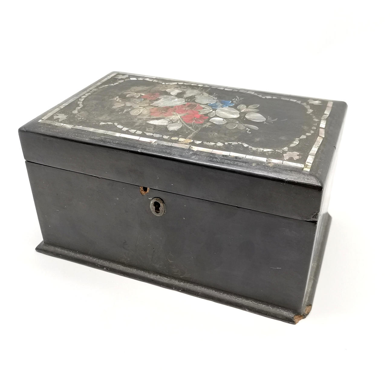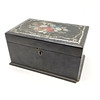 Antique papier mache box with mother of pearl & painted detail to hinged lid - 20cm x 13cm x 11cm high.