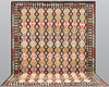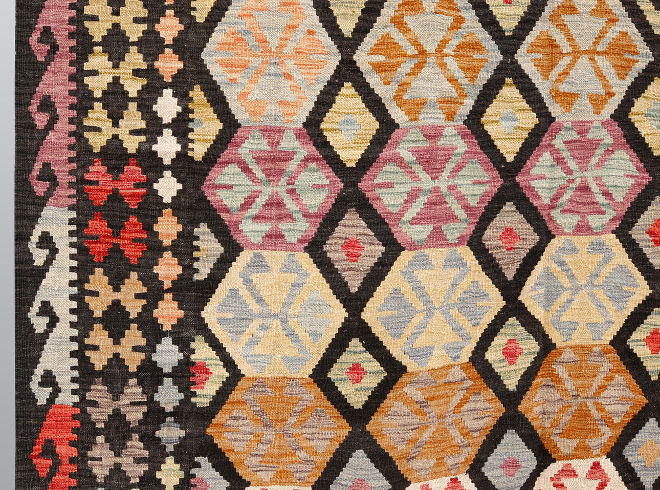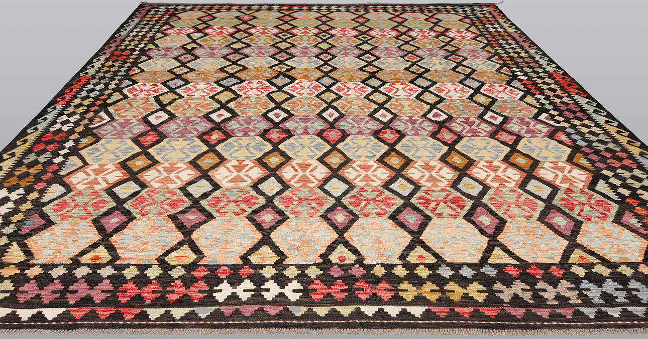 Hand-woven Kelim in classic design with geometric pattern in polychrome color scale.