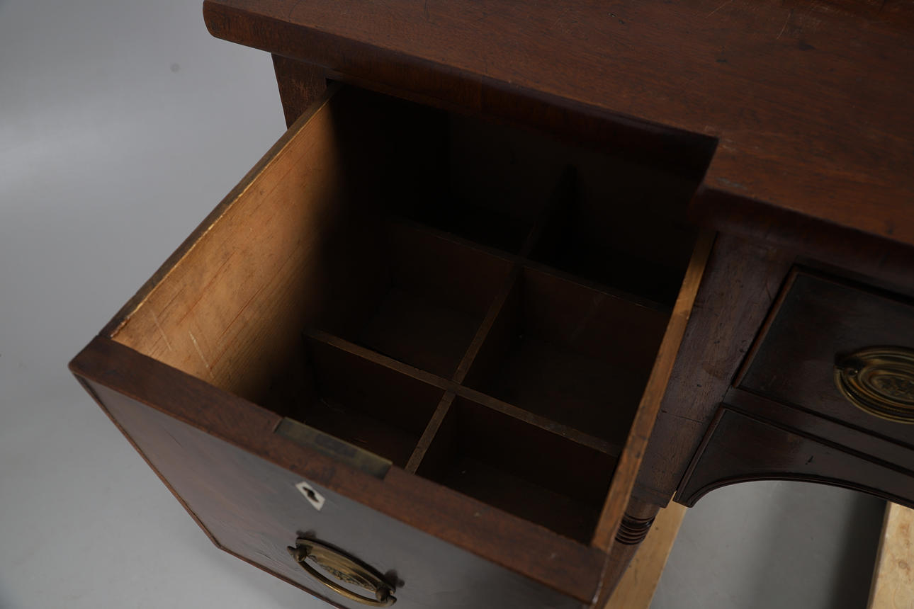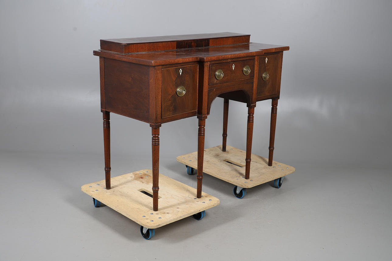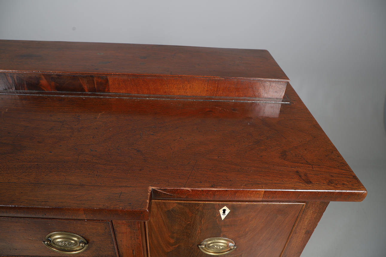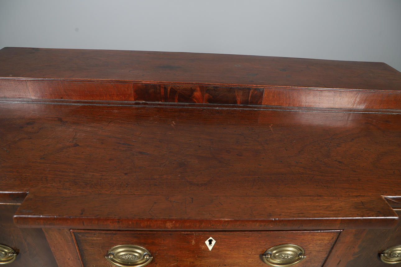 Of breakfront shape with low plinth superstructure, fitted three frieze drawers, one a six-division cellar drawer, each drawer with lozenge shaped ivory escutcheons and brass plate handles, raised on turned supports.
