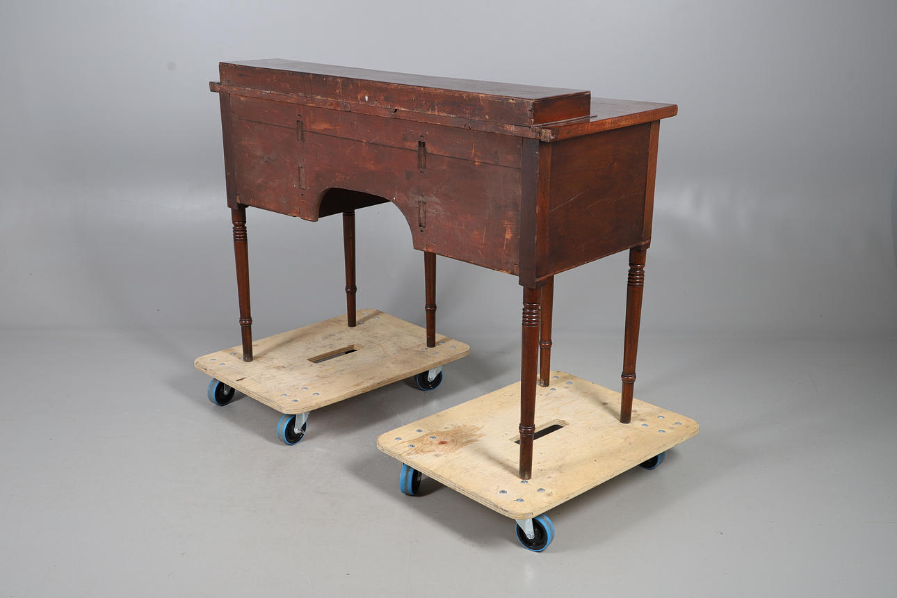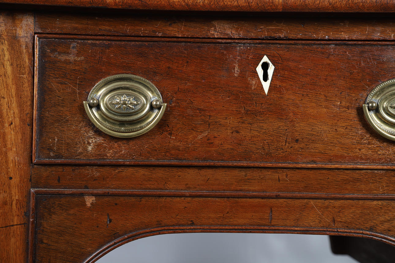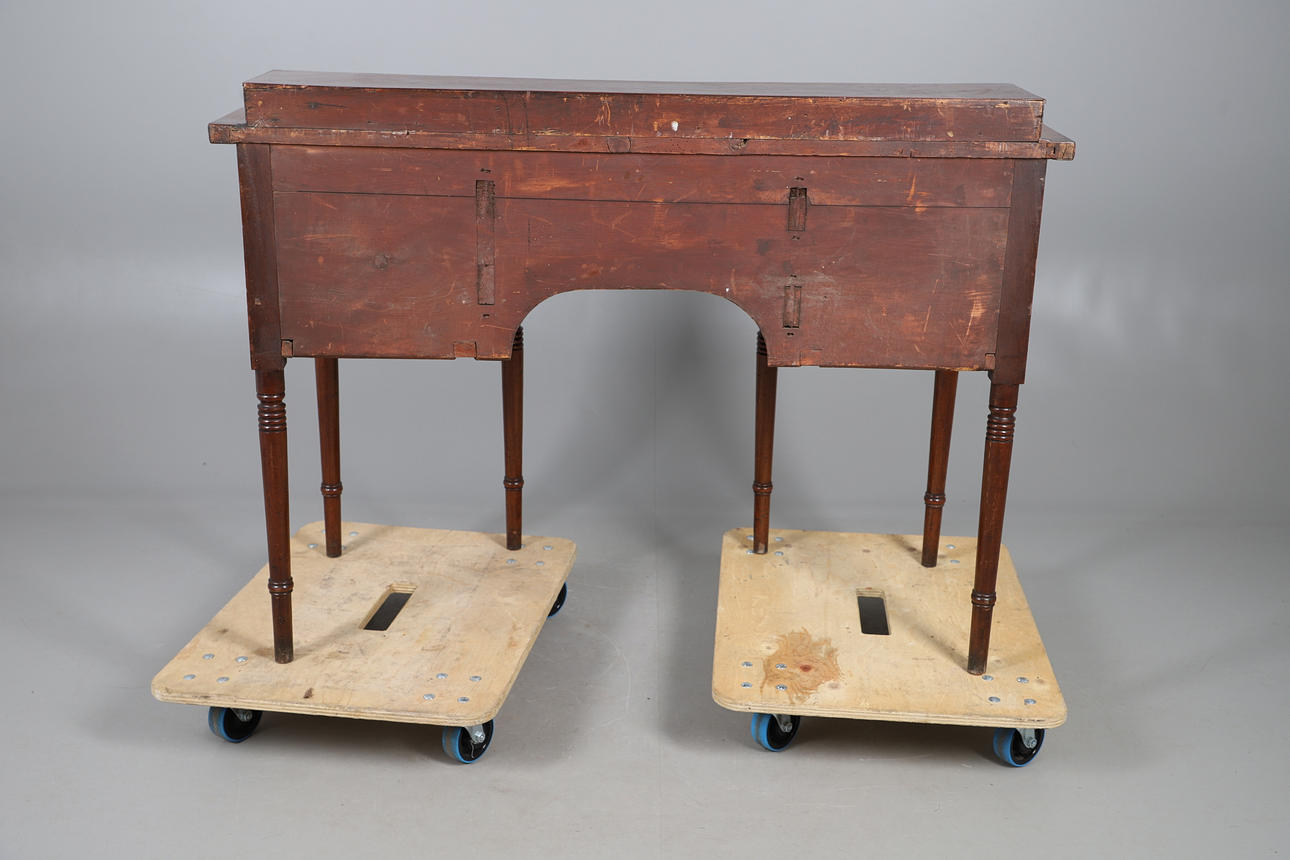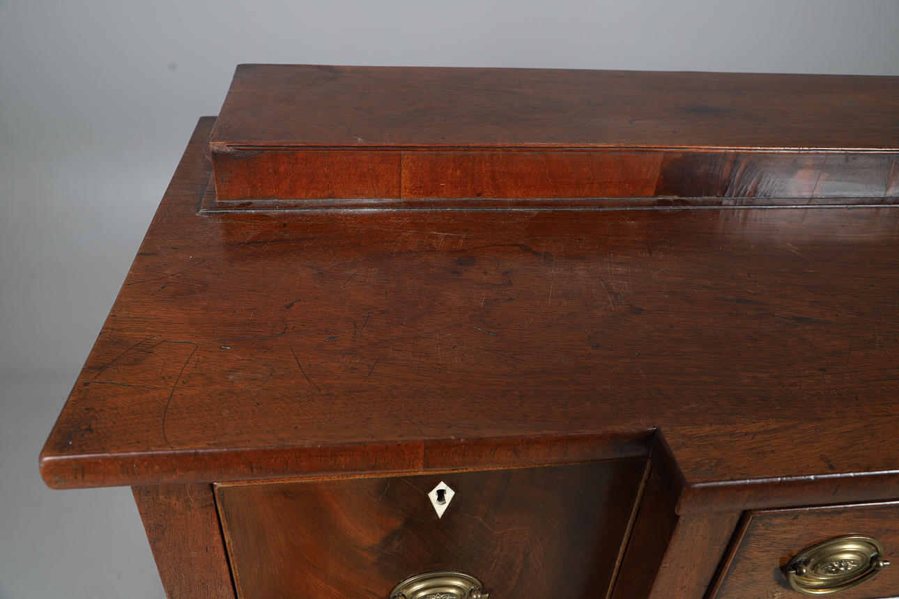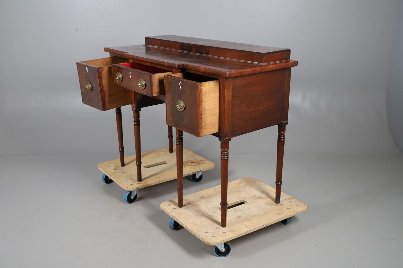 Of breakfront shape with low plinth superstructure, fitted three frieze drawers, one a six-division cellar drawer, each drawer with lozenge shaped ivory escutcheons and brass plate handles, raised on turned supports.