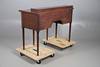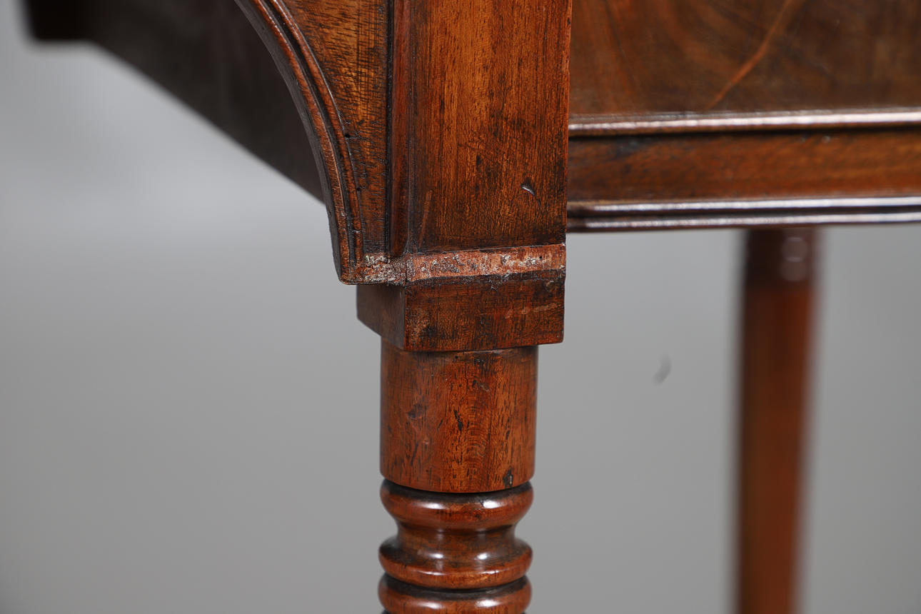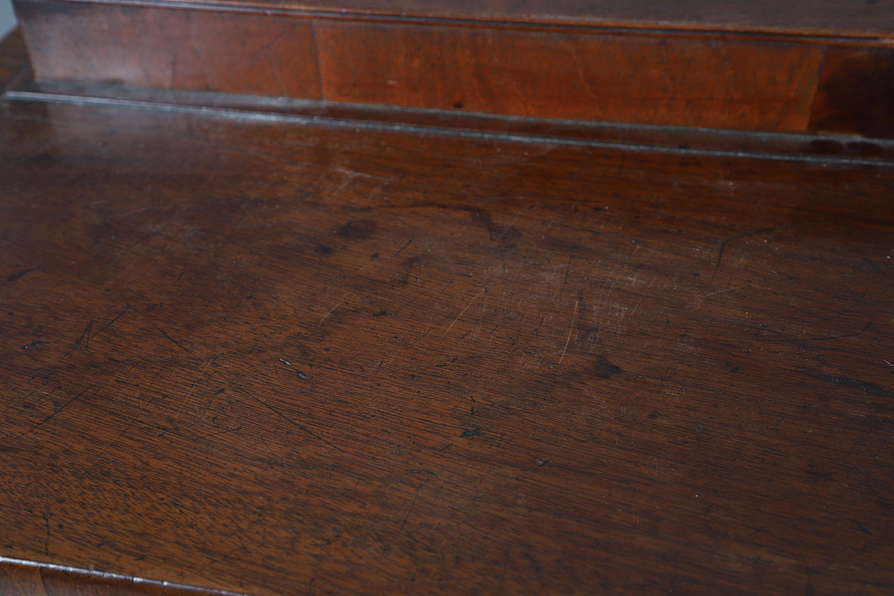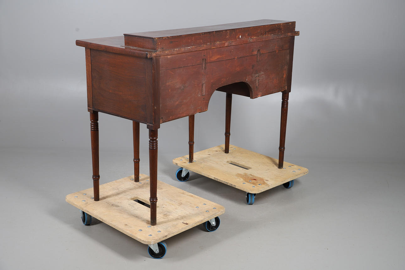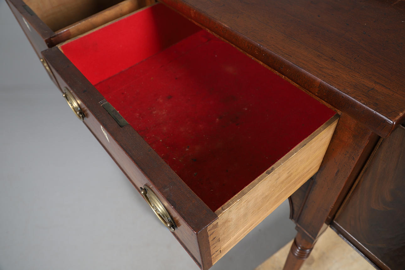 Of breakfront shape with low plinth superstructure, fitted three frieze drawers, one a six-division cellar drawer, each drawer with lozenge shaped ivory escutcheons and brass plate handles, raised on turned supports.