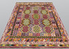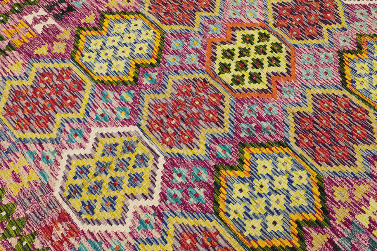 Hand-woven Kelim in classic design with geometric pattern in polychrome color scale.