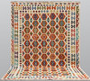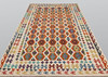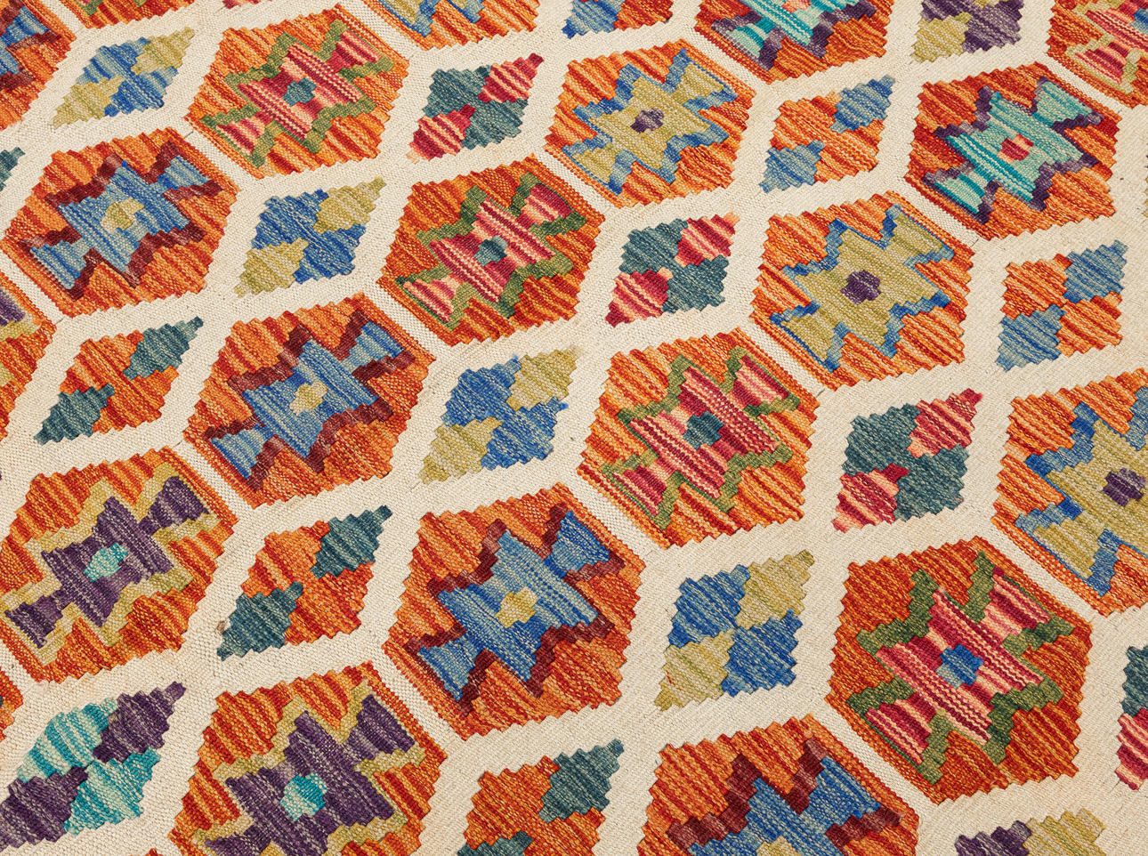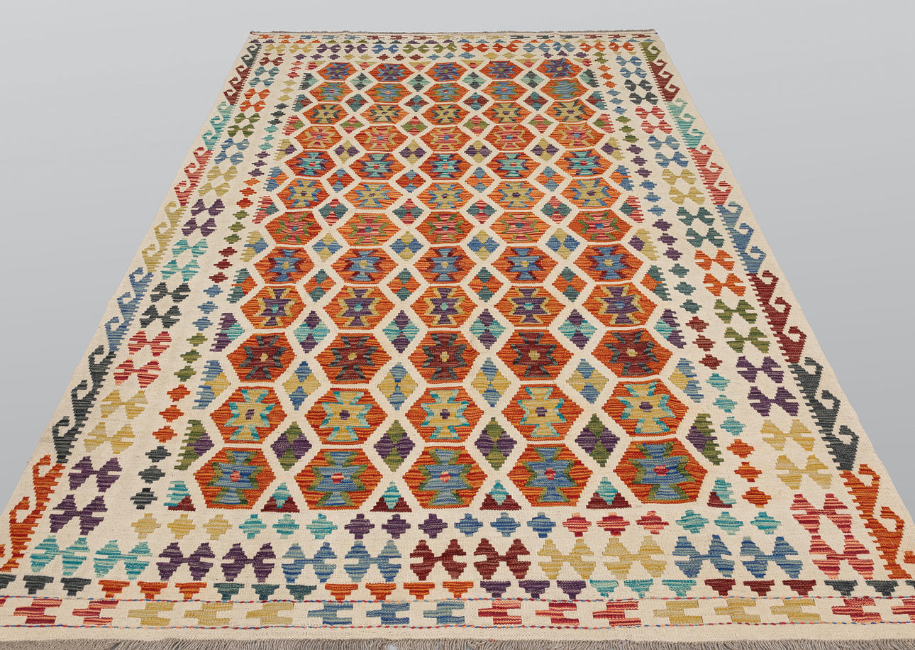 Hand-woven Kelim in classic design with geometric pattern in polychrome color scale.