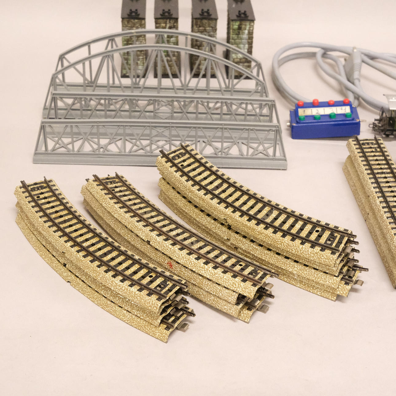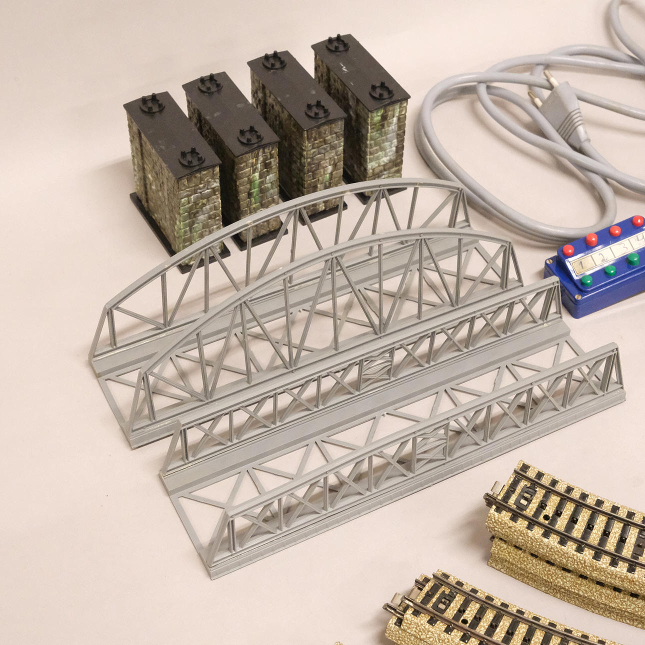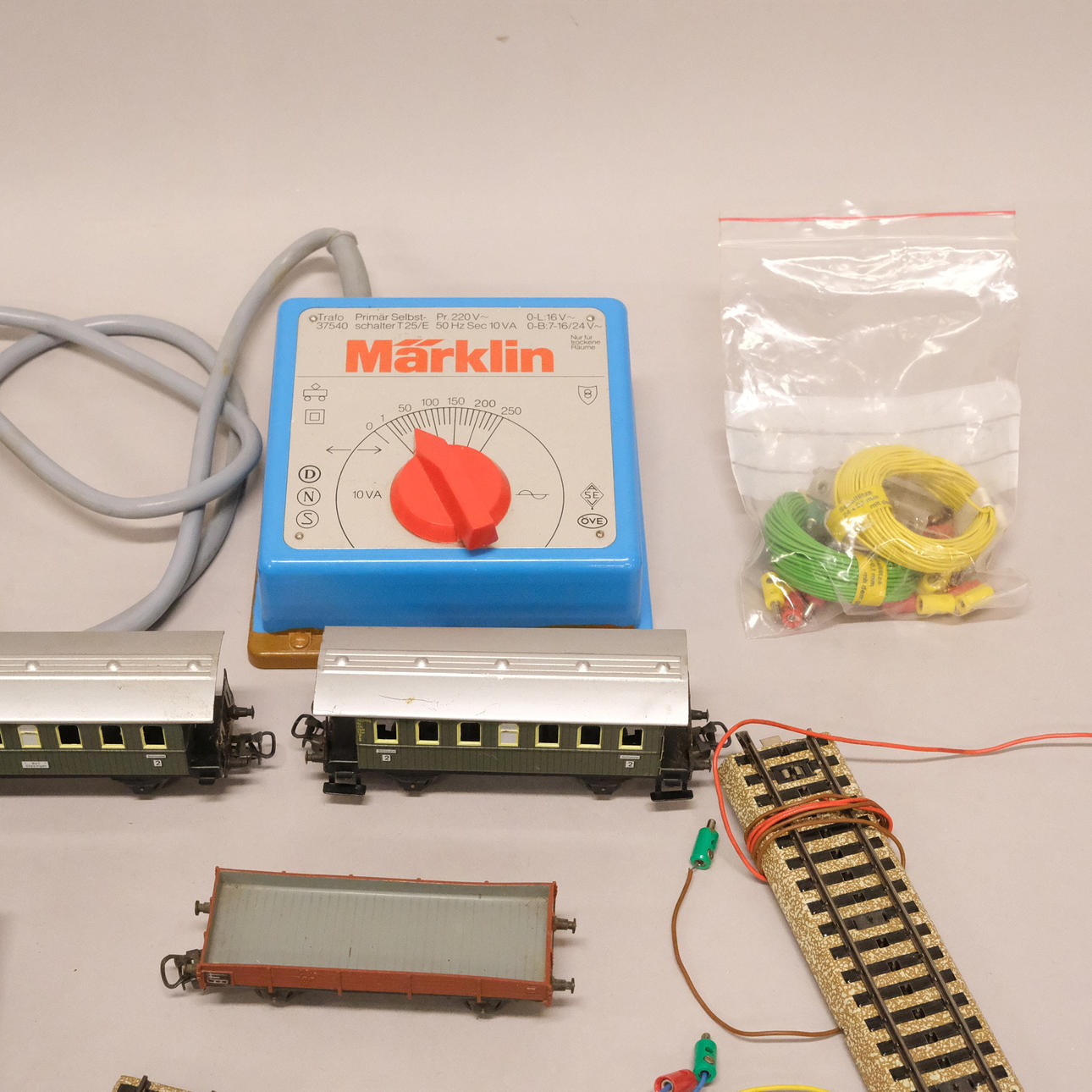 Rail, transformer, three carriages, 2 bridges, Heljan, 4 bridge pillars, accessories.