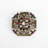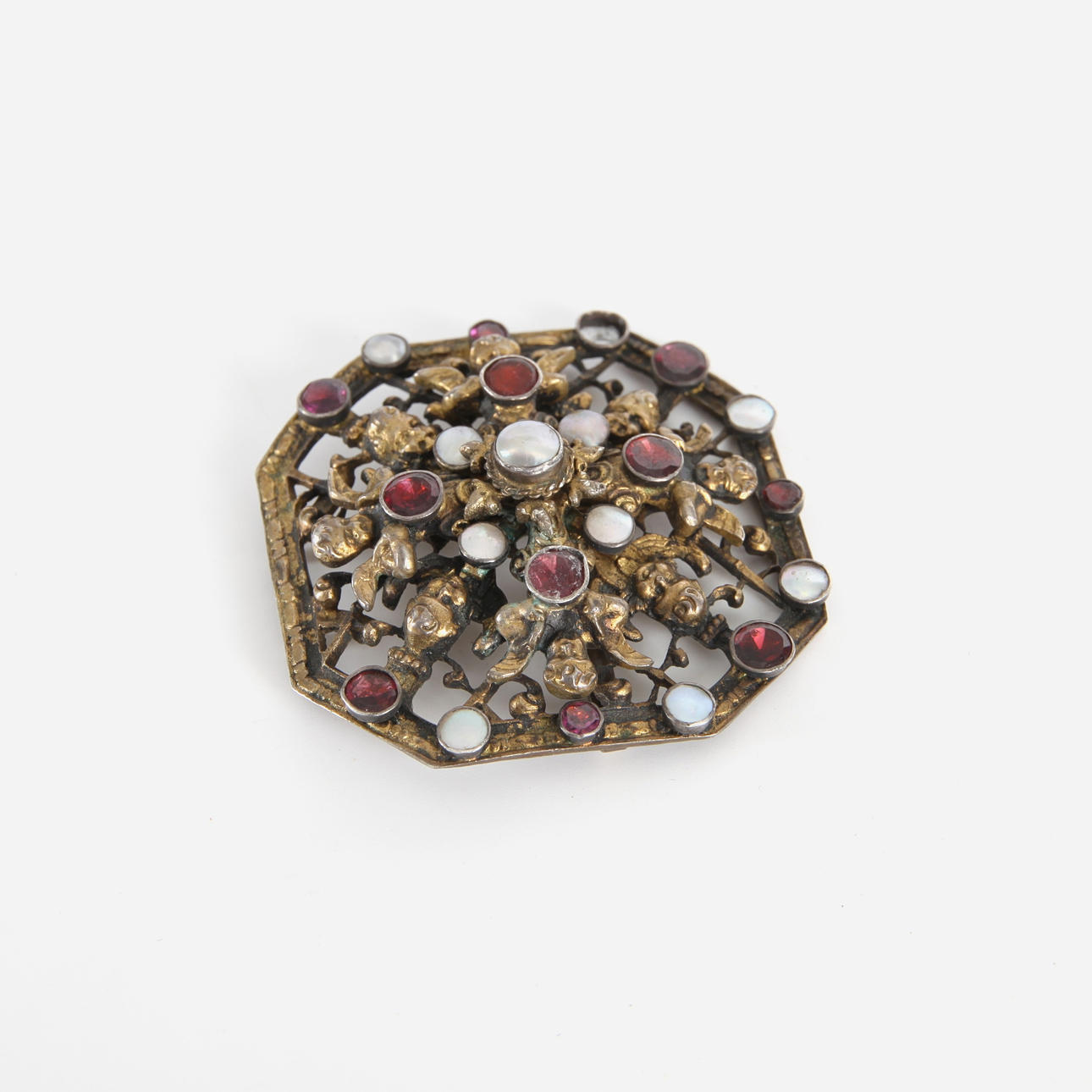 Brass-colored silver brooch/buckle with cut red stones and mother-of-pearl, decor with little angels