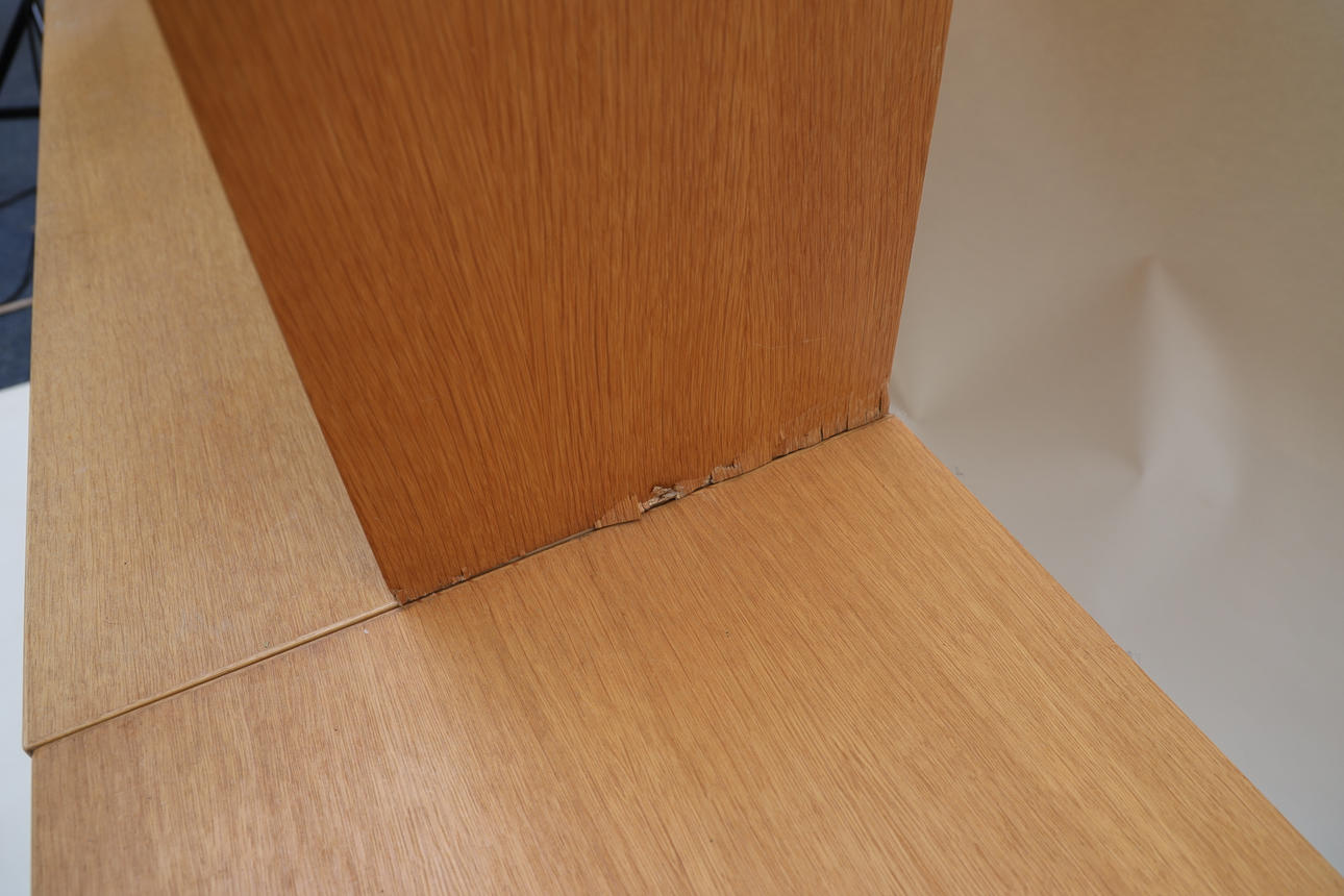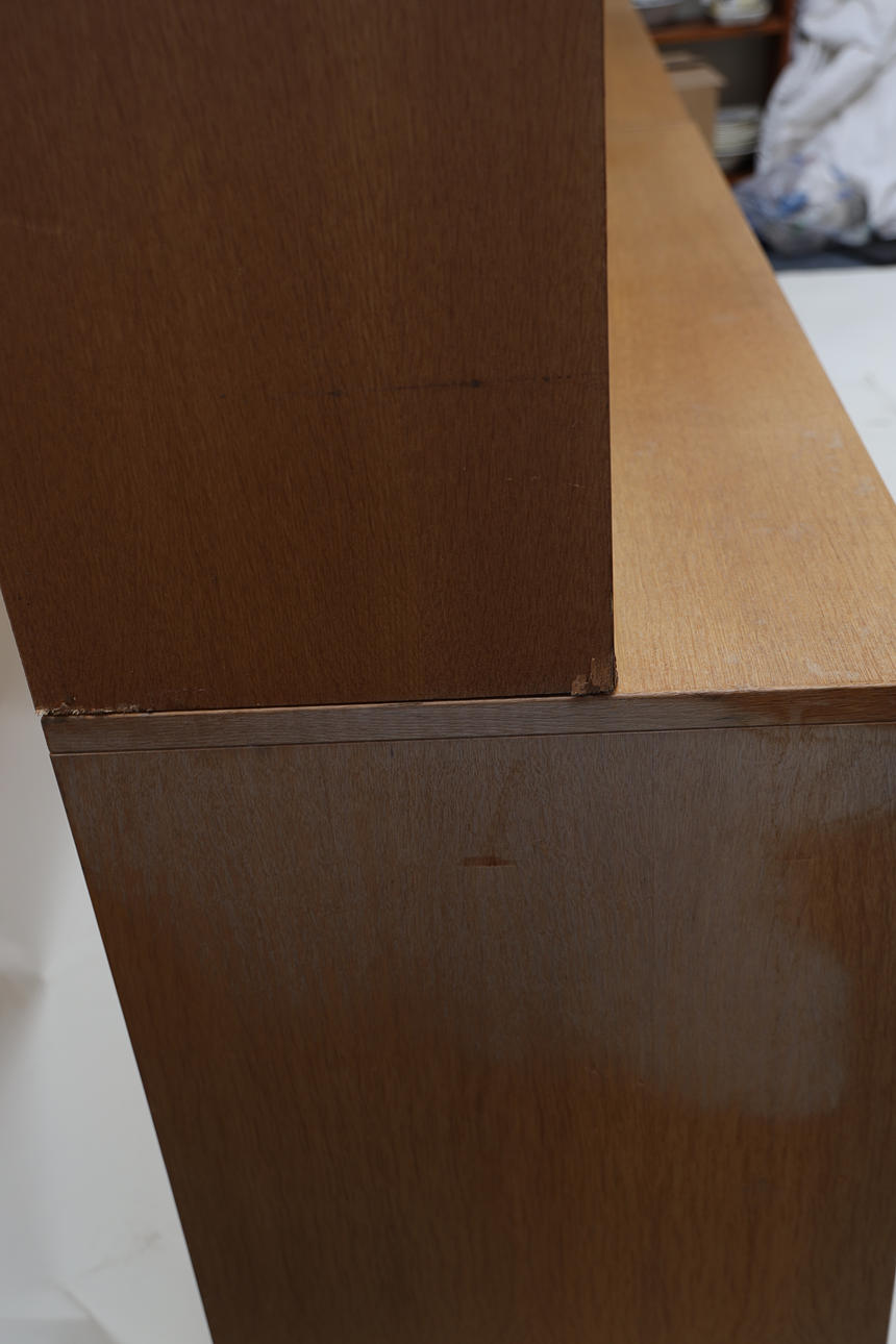 Veneer damage, stains, abrasions. Doors and drawers slightly sluggish. Usage and age-related wear.