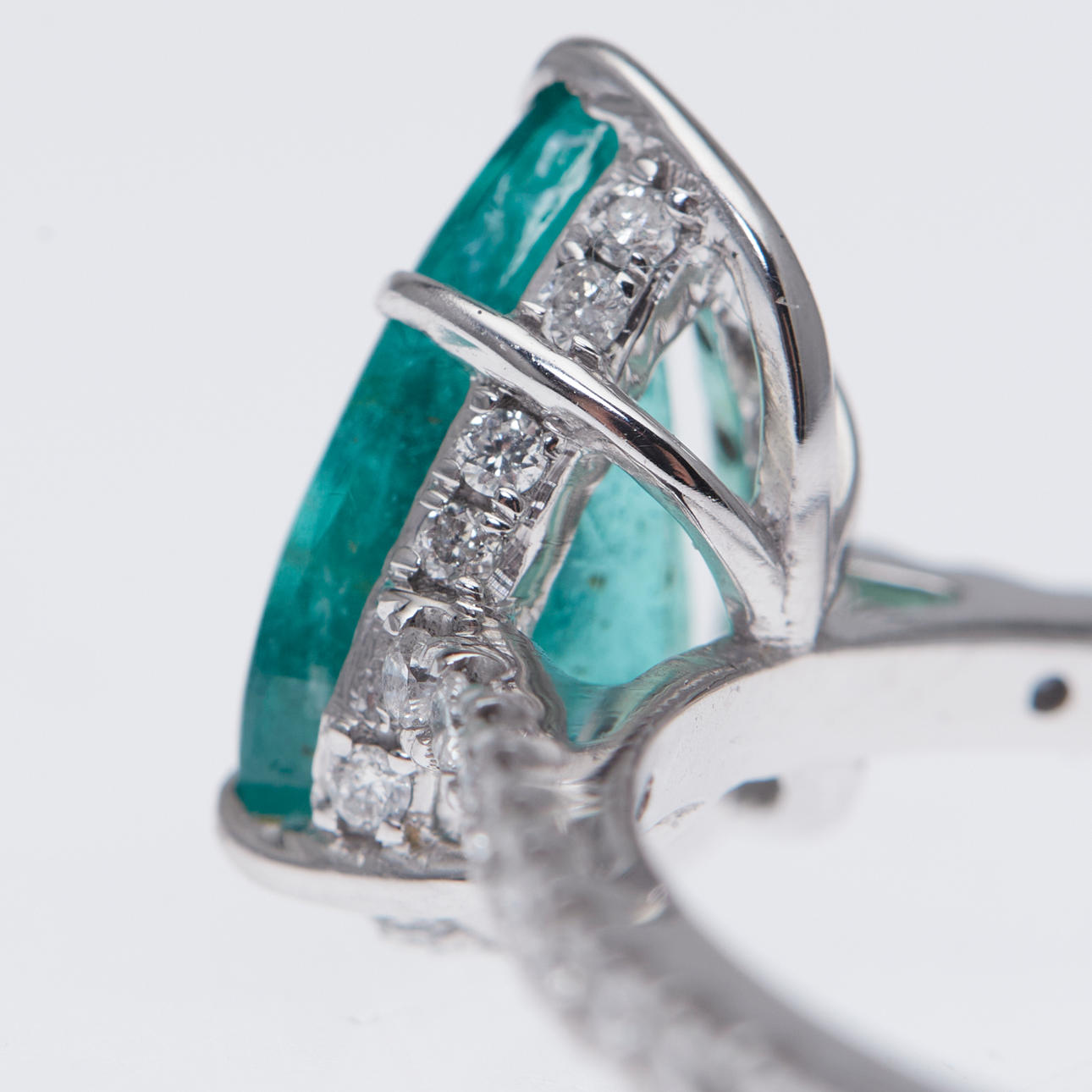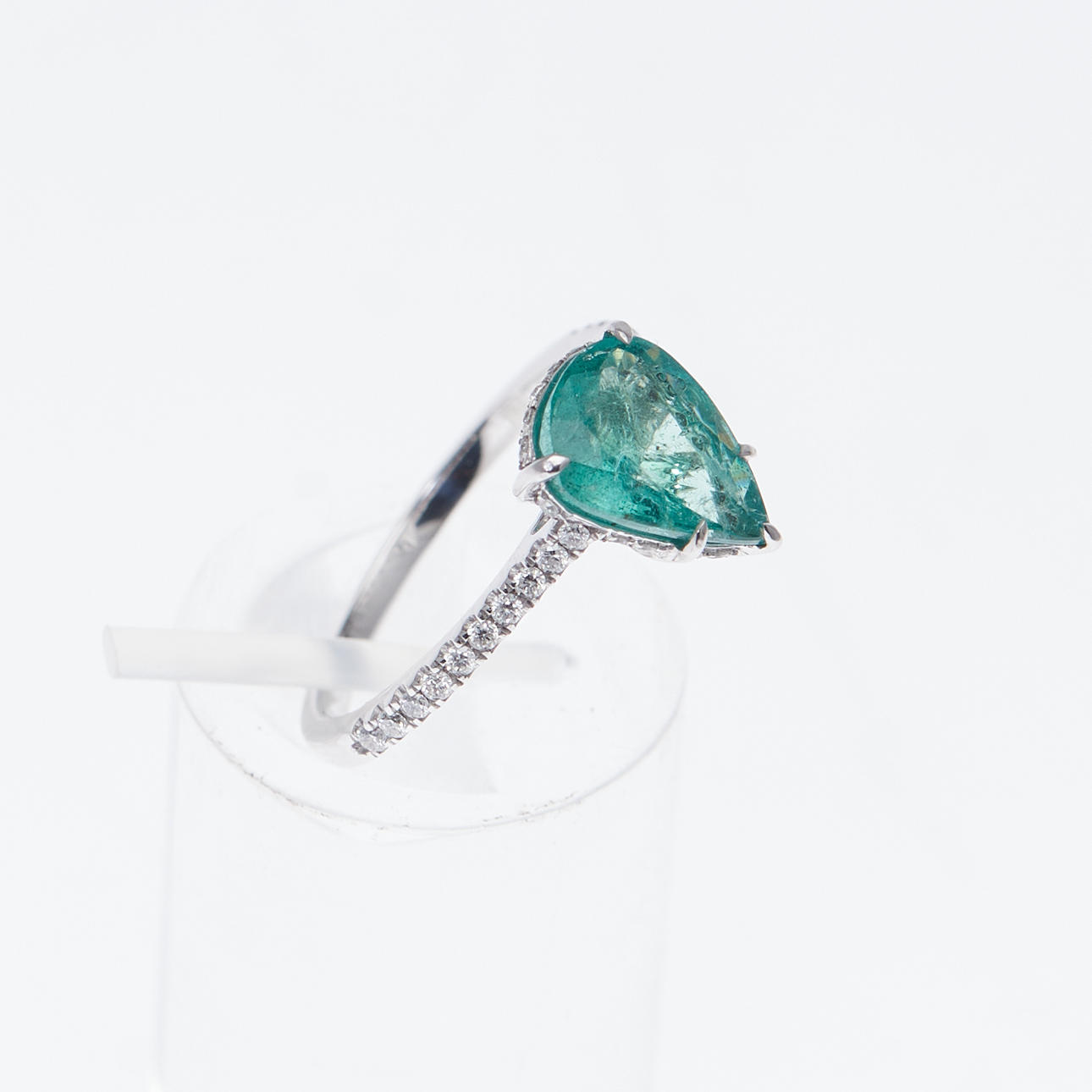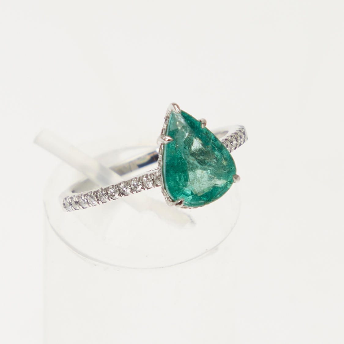 Ring made of 585 white gold, ring head set with a pear-shaped emerald, ca. 1.67 ct. Color: green, transparent Surrounded by thirty-five brilliants with a total weight of ca. 0.25 ct. Colour: Wesselton (H), Clarity: VS. Ring size: approx. 53. Ring head width: 10.3 mm Stamped, alloy tested. Weight: 2.35 g, certificate attached.